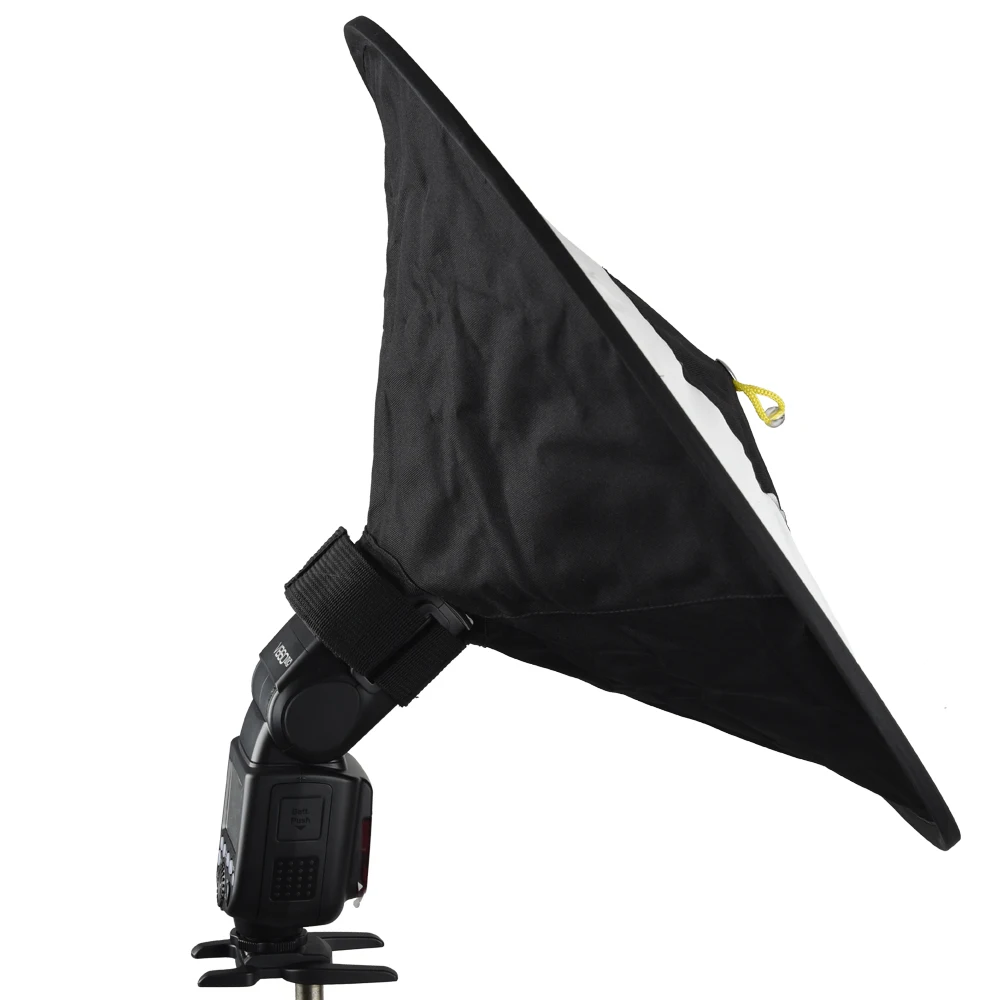 -Используйте регулируемый ремешок на липучке, чтобы прикрепить складной софтбокс к вспышке горячего башмака.