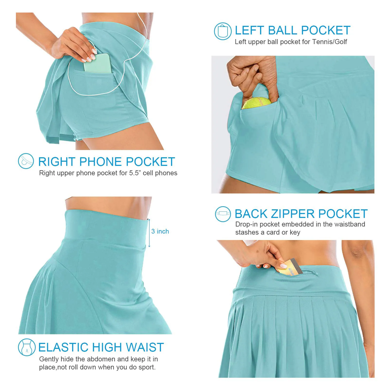 Эта короткая юбка для гольфа имеет 3 кармана, который используется для различных целей. Карманы для ног подходят для теннисных мячей, а также могут хранить предметы первой необходимости, такие как сотовые телефоны и карты... Еще один карман на молнии для хранения ключей, монет и других предметов первой необходимости.