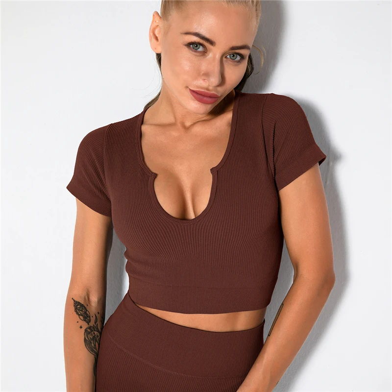 Комплект женский бесшовный для йоги, пикантный укороченный топ и шорты с завышенной талией, костюм для тренировок и бега, спортивная одежда для фитнеса, 2 шт.