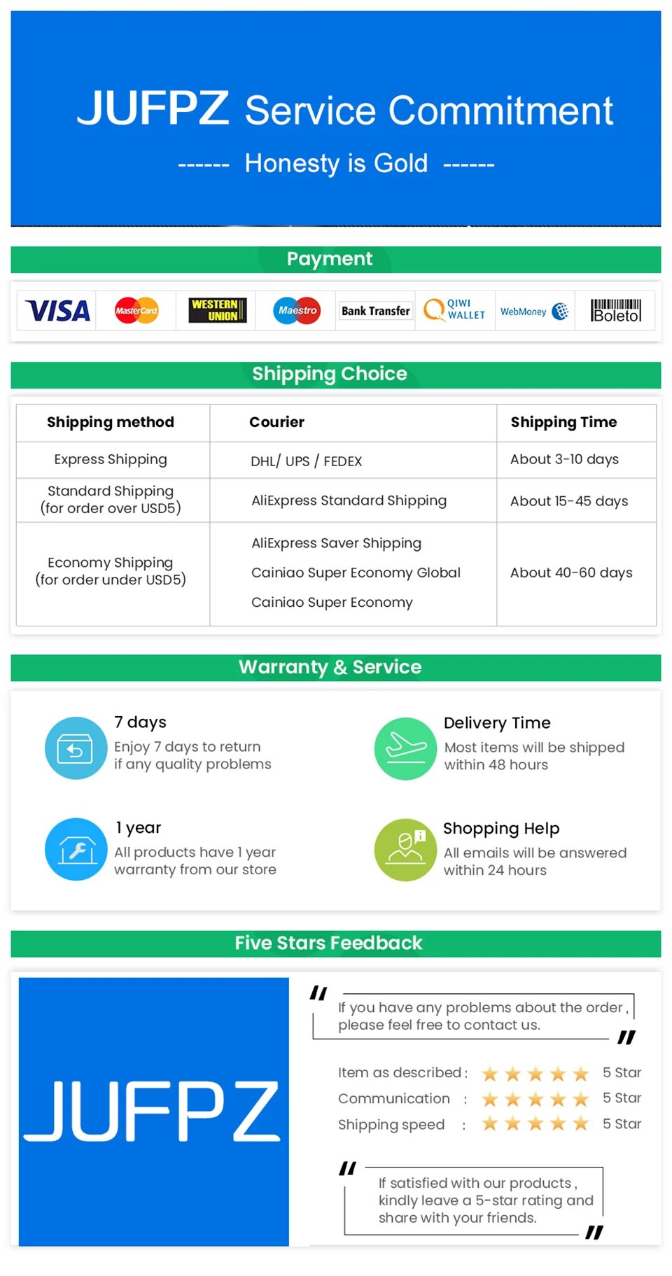 Есть древняя китайская поговорка, которую распространяет с тех пор, как более 2000 лет назад.Это «Джентльмены Несут Вещи с достоинством».Мы очень ценим встречу с вами,И мы также благодарны тем интернет-инженерам и ученым, которые способствуют прогрессу человеческого общества.Даже 50 лет назад,Если вы скажите друзьям, что я проведу пальцем дома,«Я получу подарки от faraway China в течение нескольких дней».«Я могу общаться с JUFPZ дома и говорить о жизни друг друга и мире»,Ваши друзья обязательно подумают, что вы мечтаете.Но сегодня мы сделали это.С самого начала создания бренда JUFPZ,Мы твердо верим, что мир должен быть полон любви и тепла,И эта человеческая природа по своей природе добра.Особенно сейчас, когда молодые люди, получающие образование, постепенно становятся основными в мире,Мы считаем, что искренность и красота будут существовать в любом уголке по мере развития мира.Юфпз будет джентльменом,И мы гарантируем, что каждая проблема, которую вы имеете, в итоге получит ваше наиболее удовлетворительное решение.Определенно.Давайте бережно относимся друг к другу и наслаждаемся прекрасной жизнью.JUFPZ всегда с вами с "хорошей добродетелью"!Благослови вас каждый день!