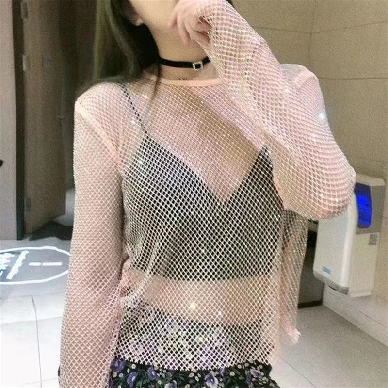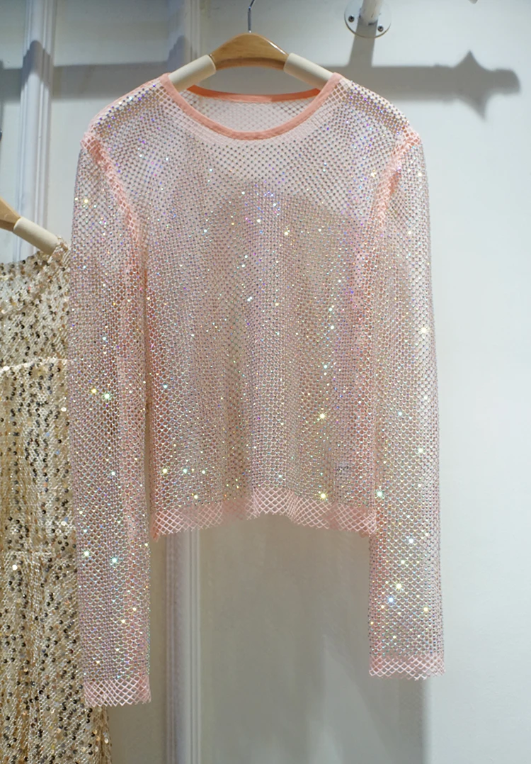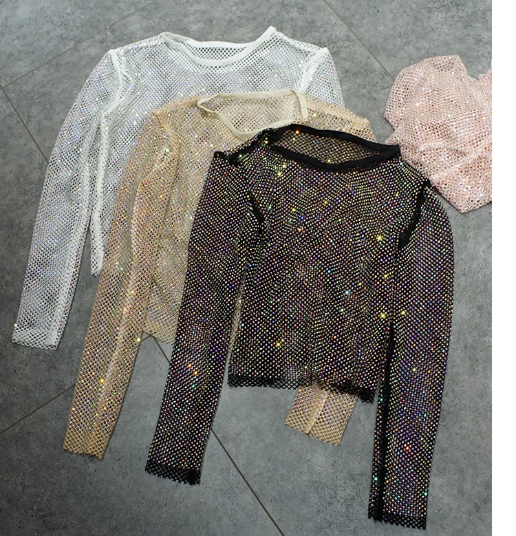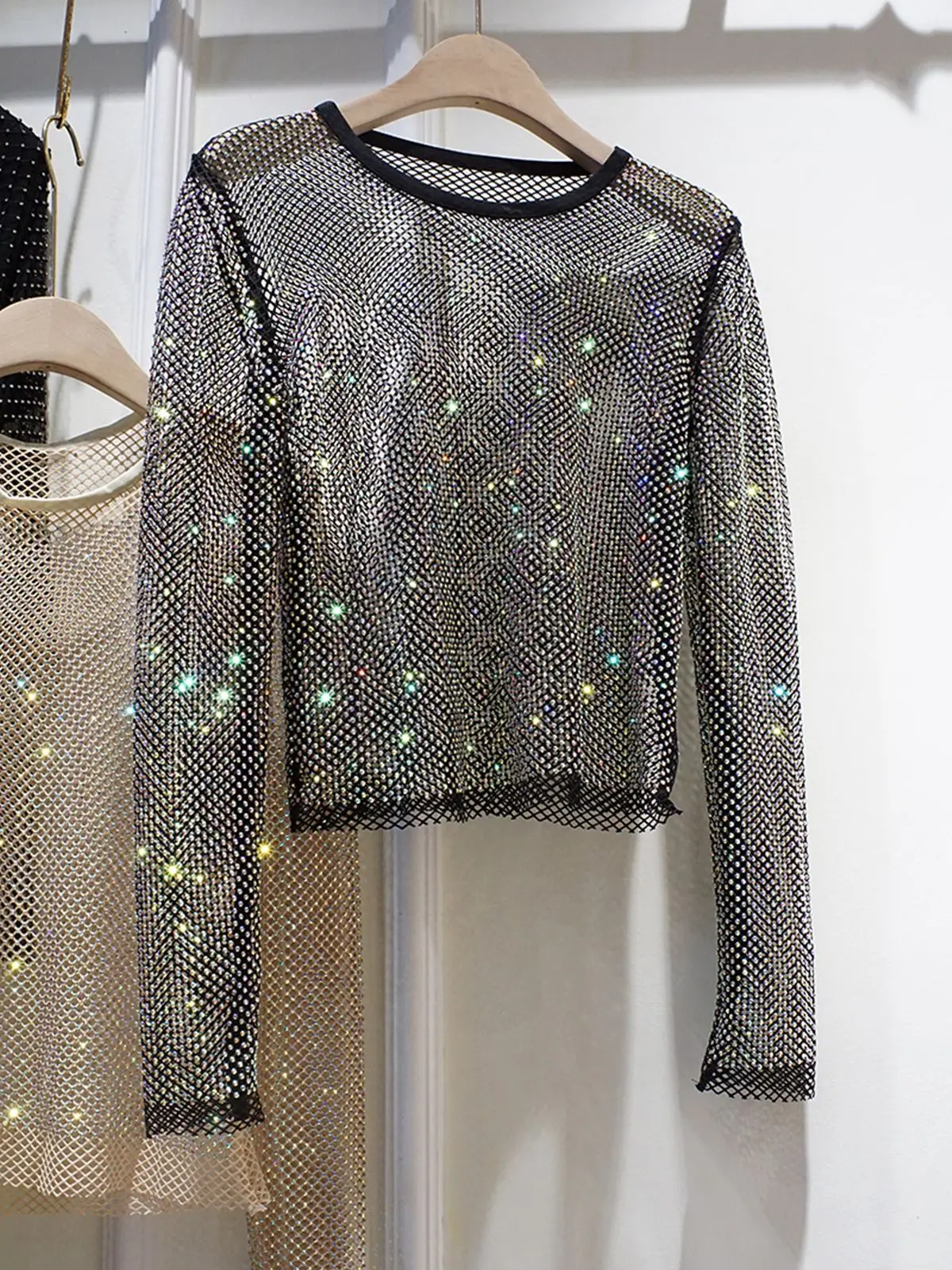 Базовая рубашка с блестящими бриллиантами, женская элегантная Облегающая рубашка с круглым вырезом и длинными рукавами, Привлекательный Топ для вечерние НКИ и клуба