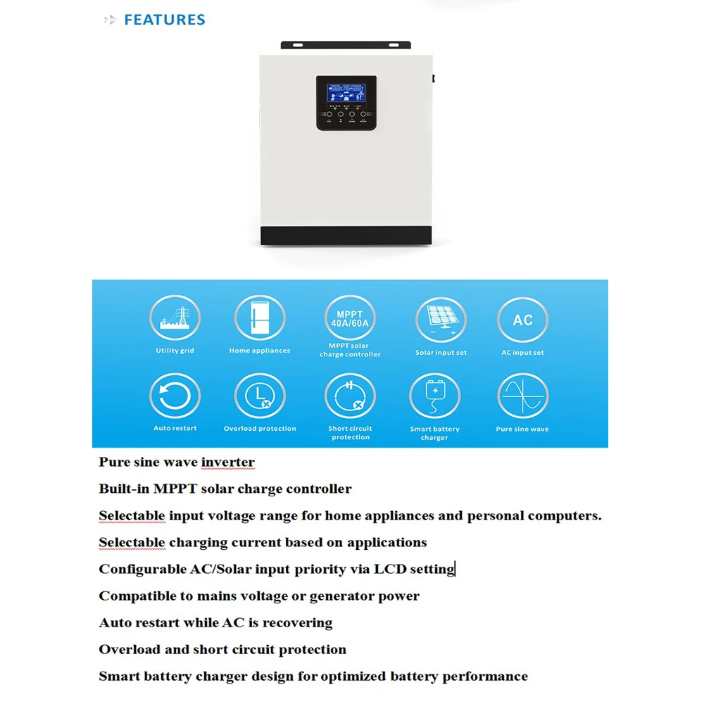 Солнечное зарядное устройство Inversor, 3 кВА, 2400 Вт, 230 В переменного тока, немодулированное синусоидальное зарядное устройство, Встроенный MPPT, 40 А, 24 В, гибридный инвертор 5060 Гц