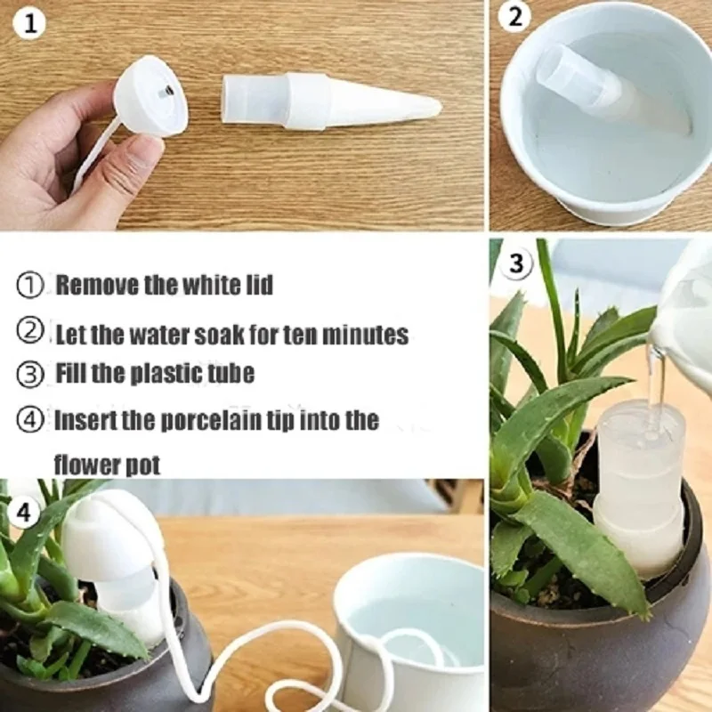 Легко настроить: Во-первых, снимите крышку и заполните керамический ворс водой и погрузите его в чашу с водой в течение 10 минут. В то же время вы можете найти бутылку и заполнить ее водой. Через 10 минут вставьте горшок для полива и пластиковую трубку в бутылку для воды.