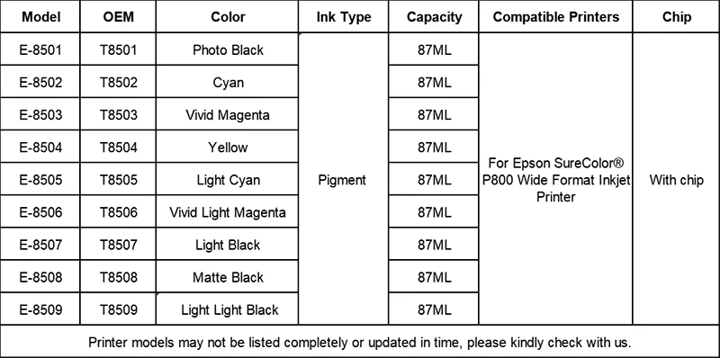 Совместимость с чернильными картриджами Epson T8501 T8501 - T8509 C13T850100 для принтера Epson SureColor P800 SC-P800