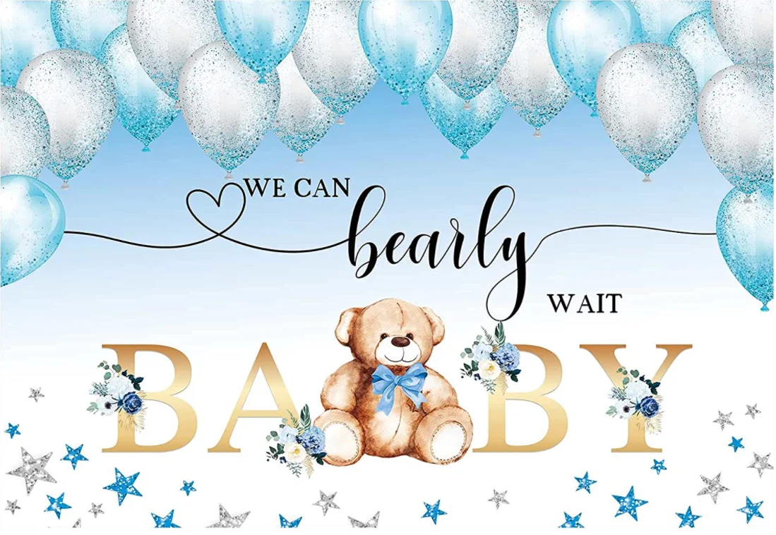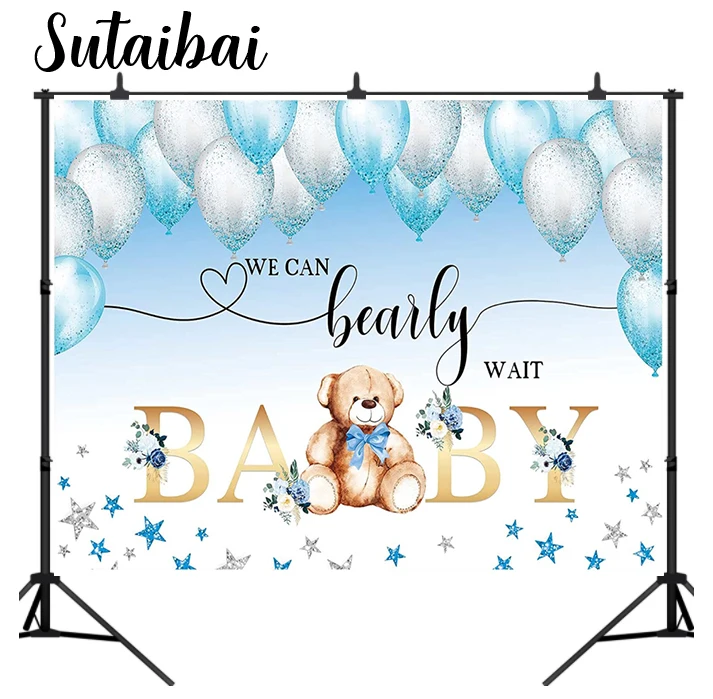 Baby Shower Медведь Вечерние фон для фотосъемки с изображением мы можем Bearly ждать акварель небесно-голубого цвета, шарики звезды Украшение стола
