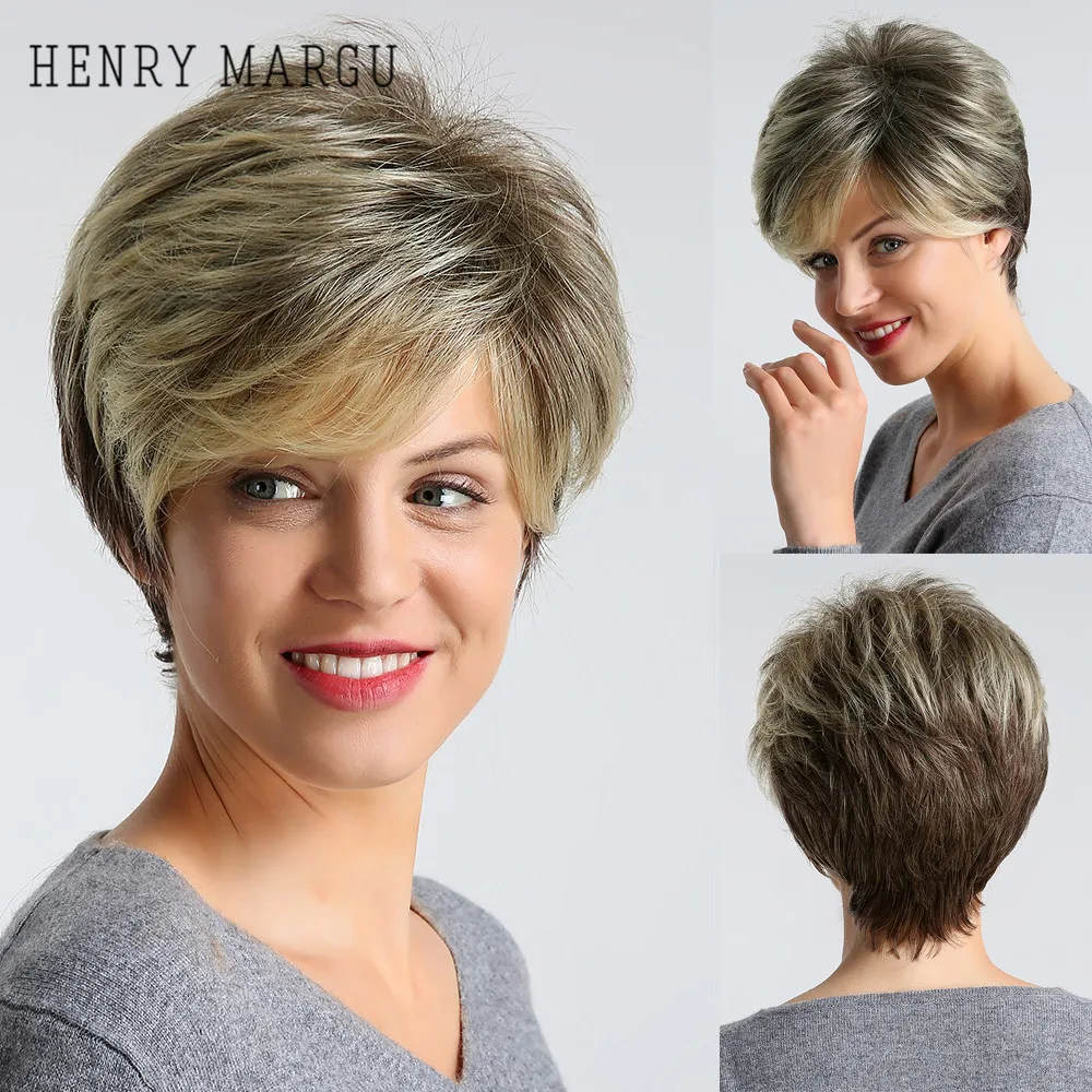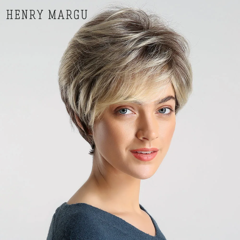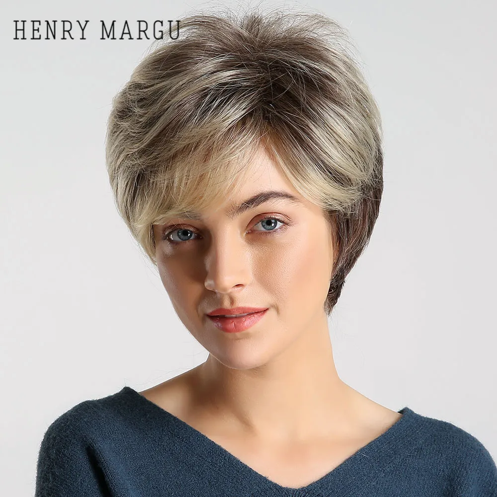 Анри маргу Омбре коричневый блонд короткие волосы парики с челкой Пушистый пикси Cut синтетический парик для черно-белых женщин термостойкие