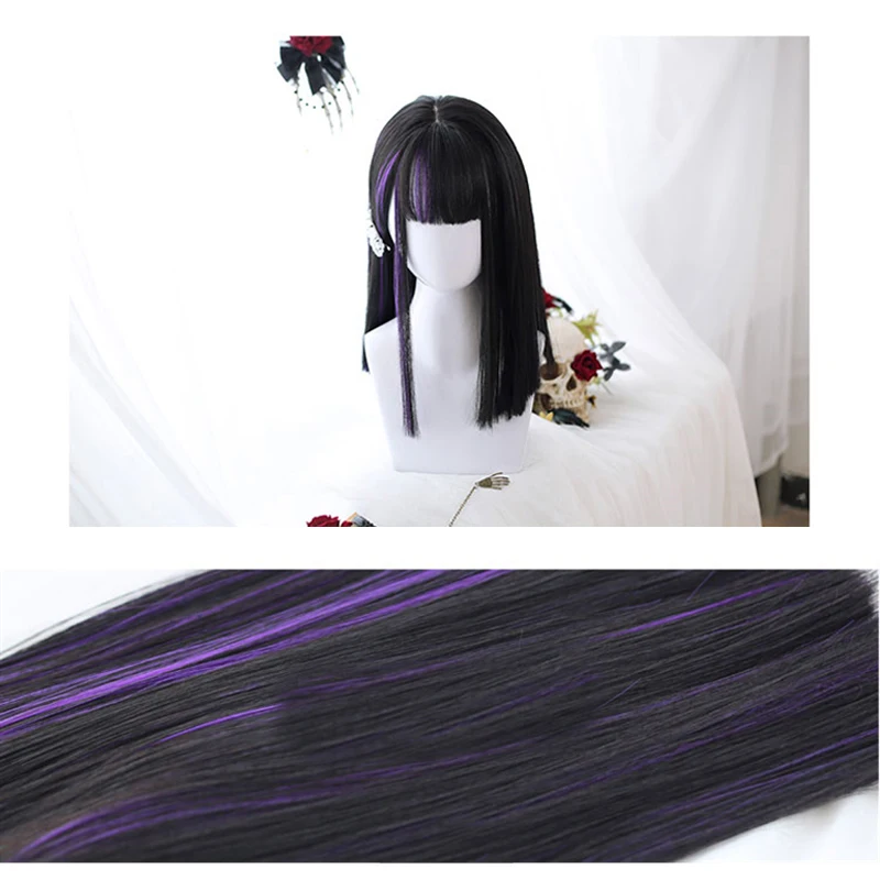 Парик Лолита в стиле Харадзюку, смешанный, черно-фиолетовый, Сказочная ведьма, для косплея, с челкой, прямой, с короткой милой бахромой, из синтетических волос для взрослых и девочек