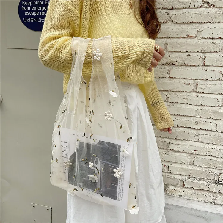 1 шт. Женская Цветочная вышивка сумочка из органзы Повседневное Сумка-тоут сетчатые сумки для покупок женские Сумки пряжи ткань пляжная сумка 2021