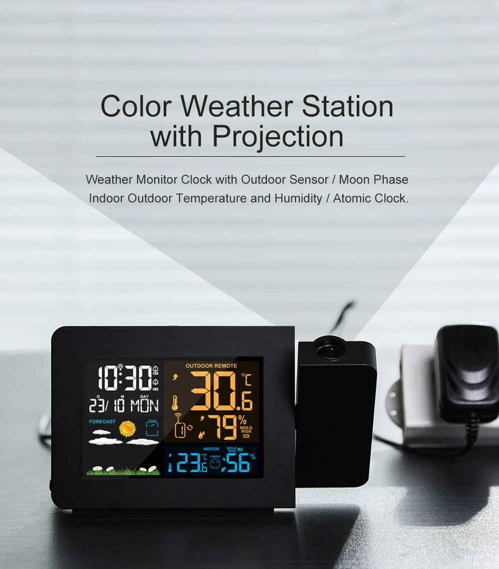 Метеостанция с проекцией/погодным монитором часы с наружным датчиком/температура и влажность внутри помещения/фазы Луны/атомные часы.