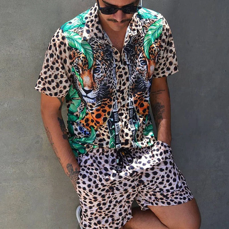 Мужской повседневный комплект из двух предметов, рубашка с отворотом на пуговицах и шорты, пляжная одежда, летний комплект, уличная одежда, винтажный Леопардовый принт