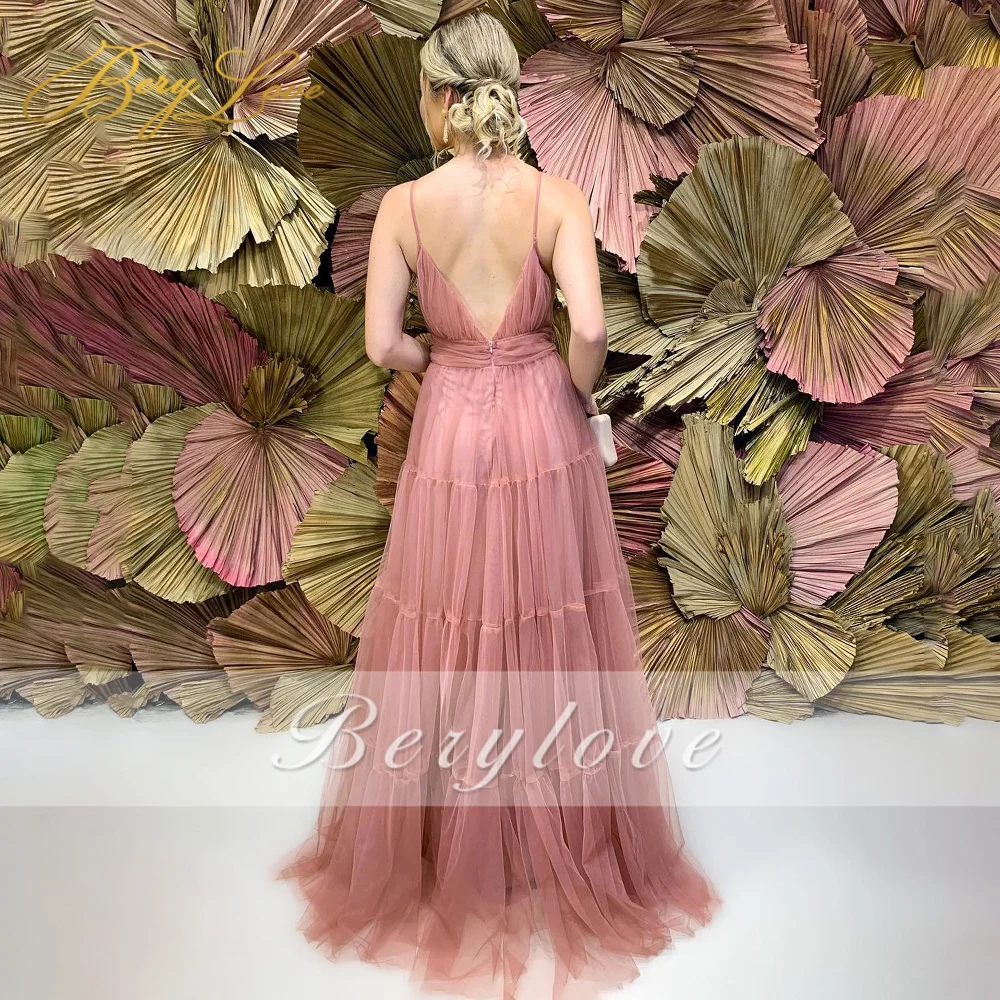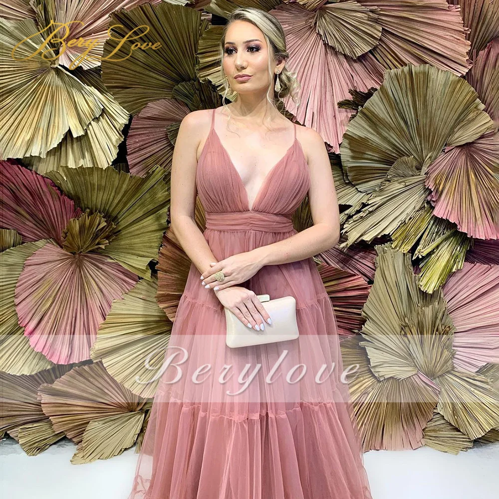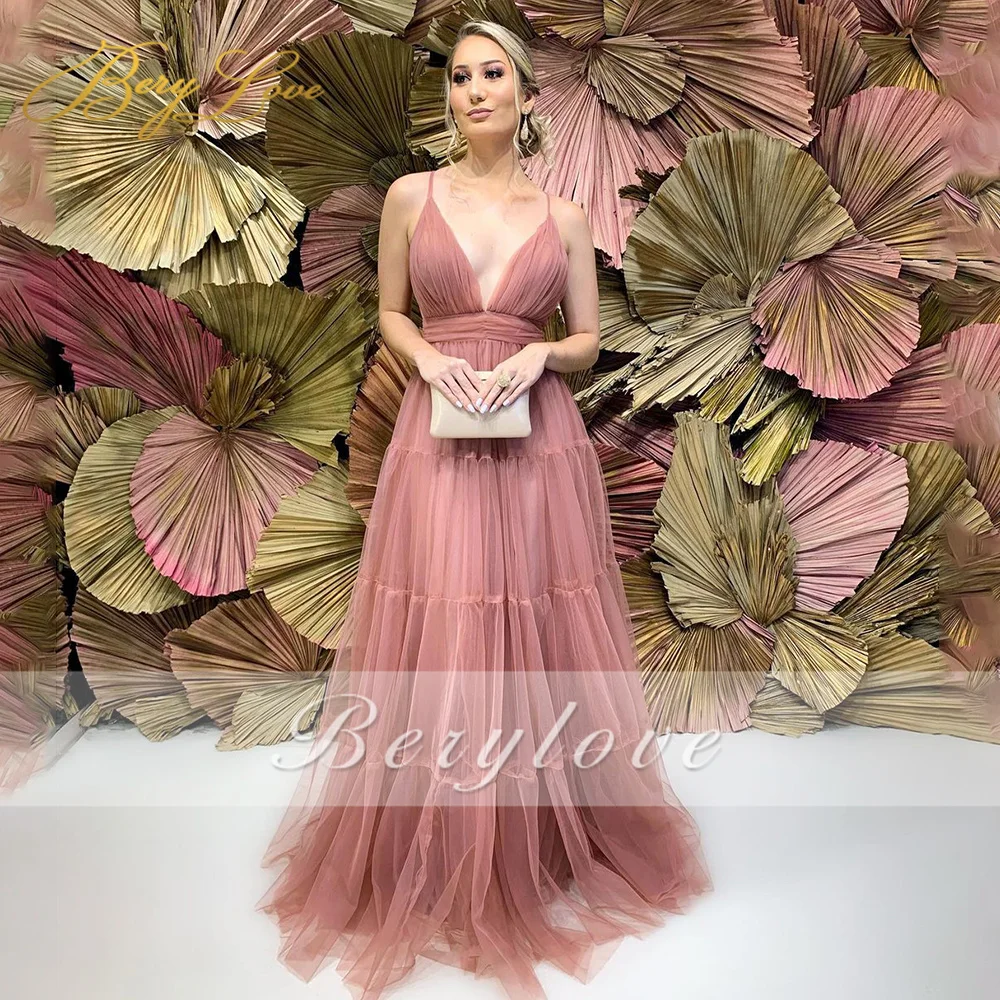 Berylove A-Line розовые длинные платья для выпускного вечера многоярусные тюлевые вечерние платья элегантные сексуальные вечерние платья с V-образным вырезом на молнии vestidos de