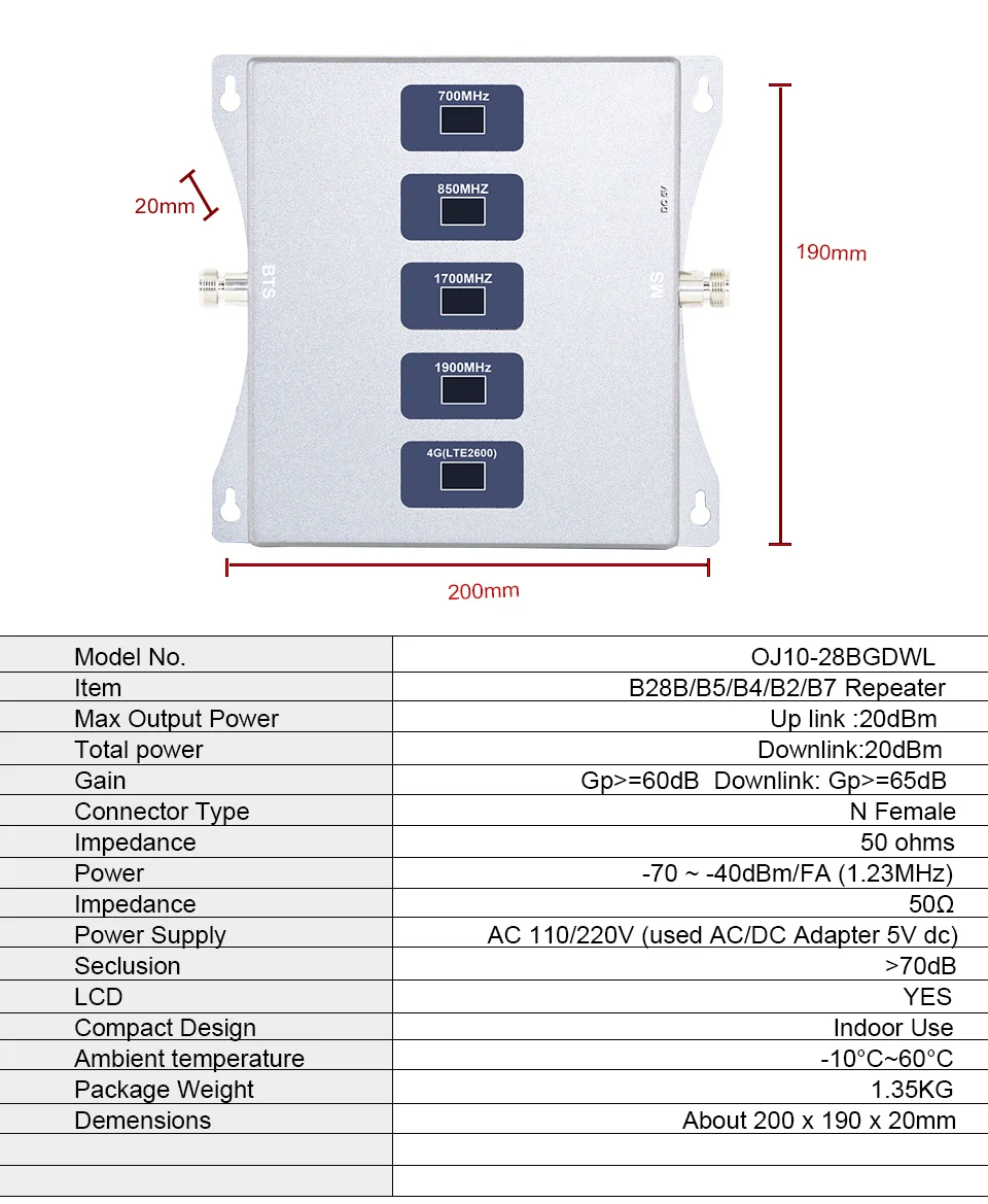 Усилитель сотовой связи B28 700 B5 850 B4 1700 B2 1900 B7 2600 МГц, пятидиапазонный GSM DCS WCDMA LTE 2G 3G 4G ретранслятор сотовой связи без антенны