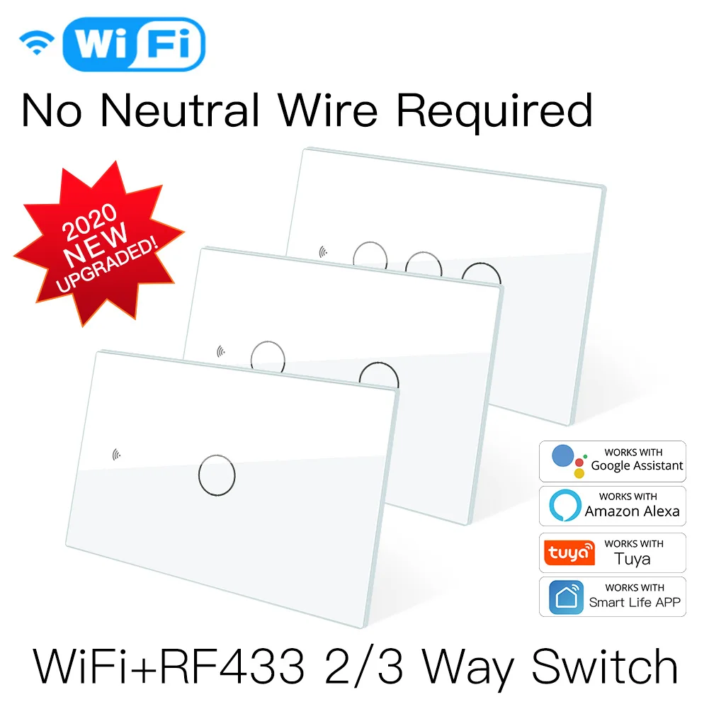 RF433 Wi-Fi настенный сенсорный Переключатель No нейтральный провод нужен Беспроводной приложение Smart Life/приложение Tuya реле статуса и Подсветка будет выключаться через пульт дистанционного управления Управление смарт с помощью одножильного провода настенный выключатель работает с Amazon Alexa Google Home 110V/220V-1 шт./2/3 банды