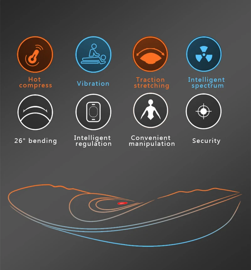 1. Интеллектуальная функция тяги, с использованием динамической возвратно-поступательной функции тяги, толкая Поясничный позвоночник вверх, тяги иРастягивание поясничных позвонков и мышц, снятие усталости поясничных мышц и уменьшение боли в пояснице и спине;2. Два режима автоматической тяги, различные конструкции высоты тяги, пользователи выбирают режим, который им подходит.3. Ручной режим тяги, пользователь может вручную регулировать высоту тяги в соответствии с его или ее уровнем комфорта, выбрать турнон или выключить функцию нагрева и функцию вибрационного массажа.4. Вибрационный Массажный дизайн с обеих сторон талии, способствует циркуляции крови и снимает усталость мышц талии;5. Технология инфракрасного нагрева, способствует циркуляции крови, уменьшает боль в пояснице и спине;6. Эргономичный дизайн кривой, разумная поддержка талии;