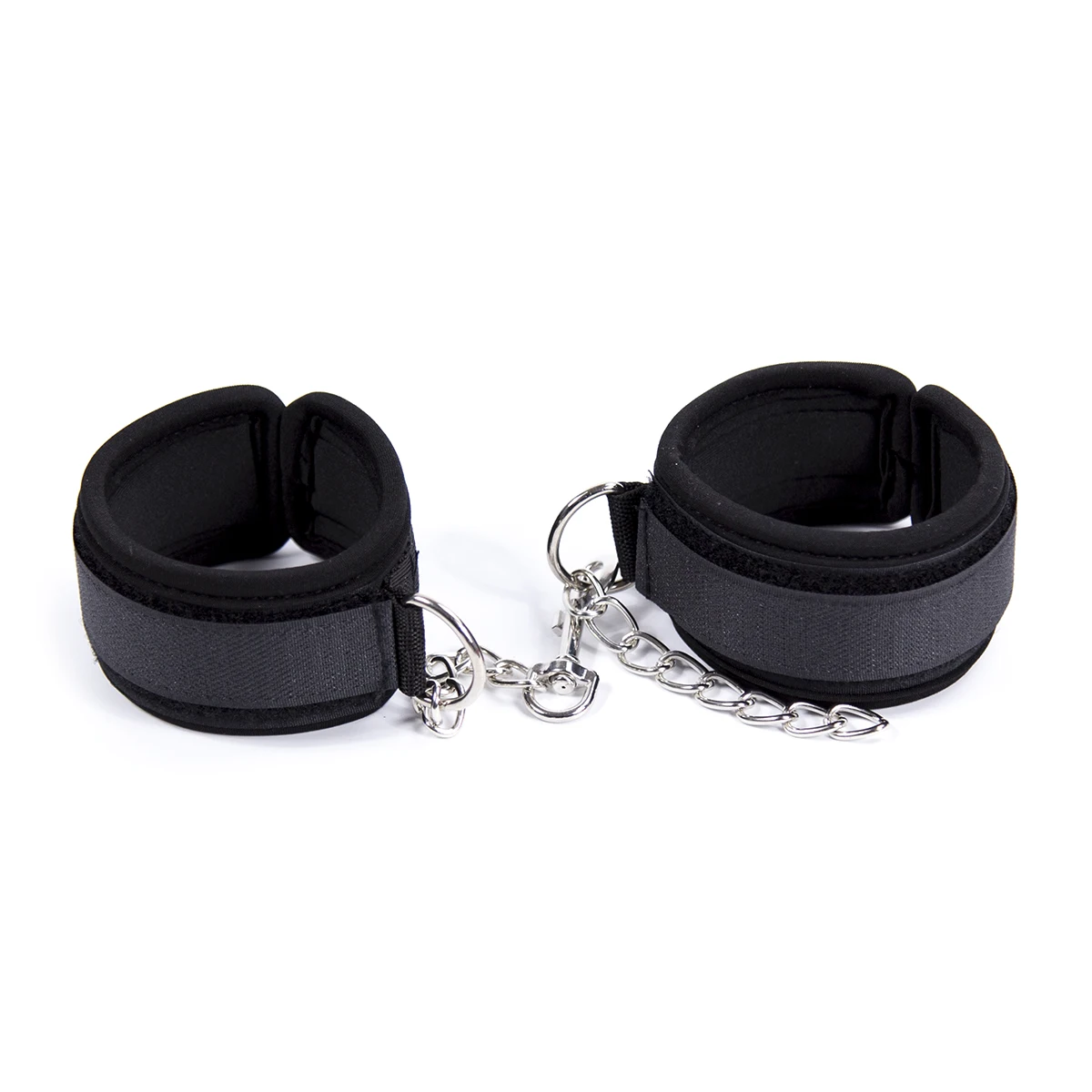 не кожные и даже не кожзам. Наручники на липучках и из дешёвого материала, что как-то в минус атмосфере. Цепочка чересчур длинная.