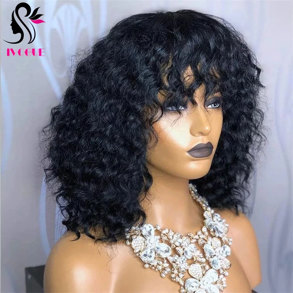 Женский парик из вьющихся человеческих волос с челкой, 180% плотность, перуанские неповрежденные волосы, верхний парик из человеческих волос, искусственный естественный цвет