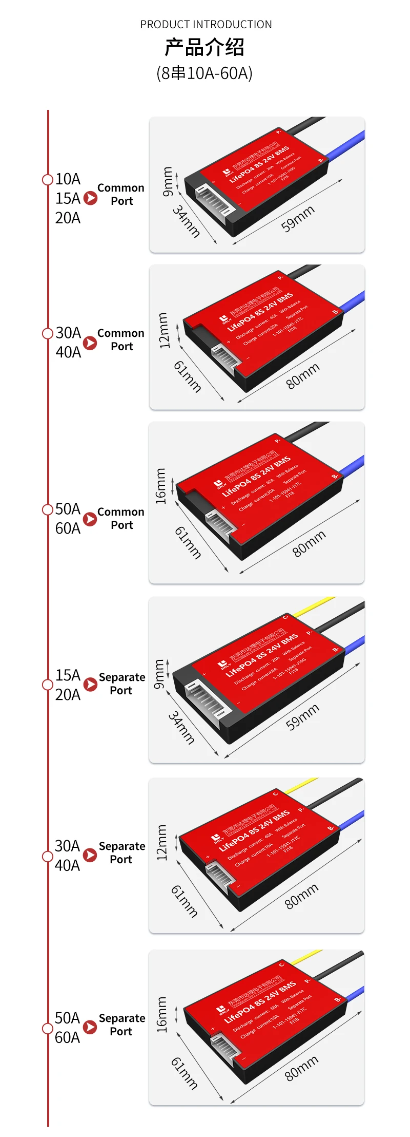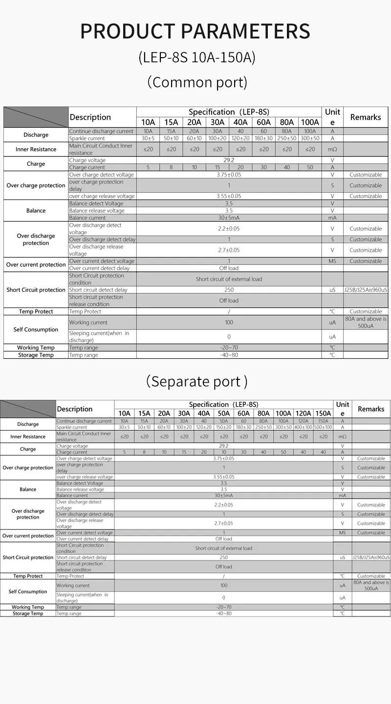 Daly Водонепроницаемый 8s 24v 29,6 v 15A 20A 30A 40A 50A 60A 80A BMS литиевый lipo lifepo4 bms для электрического скутера, для литиевой батареиМодель: DL8S (LiFePO4 с номинальным напряжением 3,2 В, не для литий-ионной батареи с номинальным напряжением 3,7 в)Обычная версия: общий порт для зарядки/разрядкиОтдельная версия: отдельный порт для зарядки/разрядкиМы можем настроить любую печатную плату от 1S до 30S литиевых батарей с разным током.Особенность: для той же модели ток заряда меньше тока разряда, так как платы Daly были обновлены для надежной защиты аккумулятора клиента. По любым вопросам, пожалуйста, свяжитесь с нами. Daly: январь 2020Обзор◆ Плата DL8S24V15A/20A/30A/40A/50A/60A используется для аккумуляторных батарей серии 8 24 В.◆ Мы можем конструировать его для различных литиевых батарей, таких как LiFepo4, LiMn2O4, и Li-polymer и т. Д.◆ Основные функции: защита от перезарядки, защита от разрядки, защита от перегрузки по току, защита от короткого замыкания, защита от температуры и т. д.◆ Согласно запросу клиента мы можем разработать PCM в различных размерах и структурах.◆ BMS изготовлено высококачественными импортными МОП и ИС. Длительный срок службы батареи.2. Преимущество◆ Используйте высококачественную (A-level) Защитную интегральную схему IC, от решения Seiko из Японии.◆ Высокая нагрузка, ток постоянная разрядка 15 а/20 А/30 А/40 А/50 А/60 А, сопротивление высокого напряжения, низкое внутреннее сопротивление мощности полевого МОП-транзистора. Радиатор значительно поможет охлаждать.◆ IC сам имеет функцию балансировки мощности. Схема проста и надежна.◆ Типичное Определение напряжения для каждой ячейки. Таким образом, каждый аккумулятор не будет перезаряжен или разряжен. Функция защиты от перегрузки по току и короткого замыкания очень надежная. Длительное короткое замыкание нагрузки не влияет на печатную плату и аккумулятор. Температурная защита во время зарядки и разрядки.◆ Очень низкое энергопотребление. Потребление всего устройства составляет менее 50 мкА.◆ На печатной плате используется высокая защита от коррозии, Высокая водонепроницаемость, высокое сопротивление ESD конформное покрытие.
