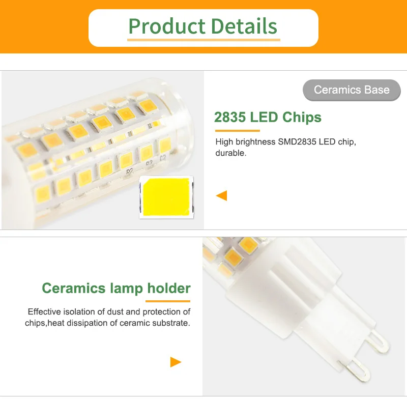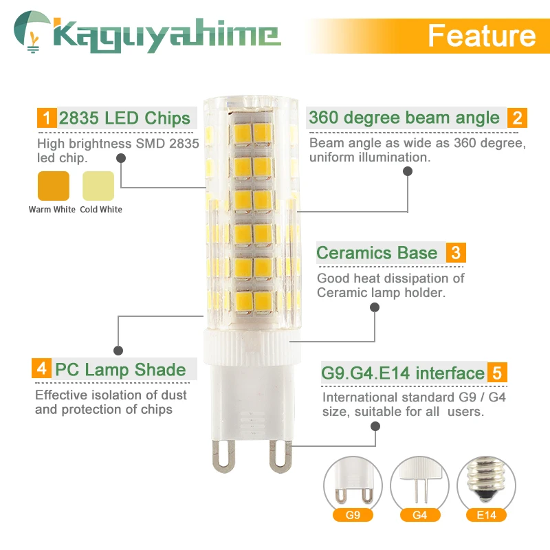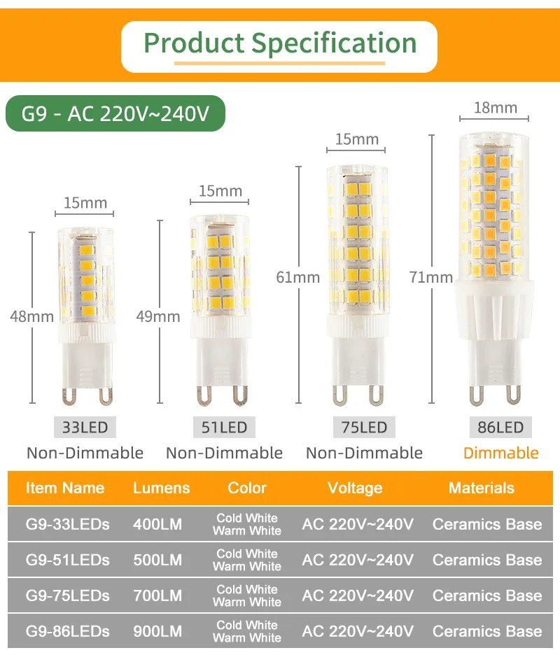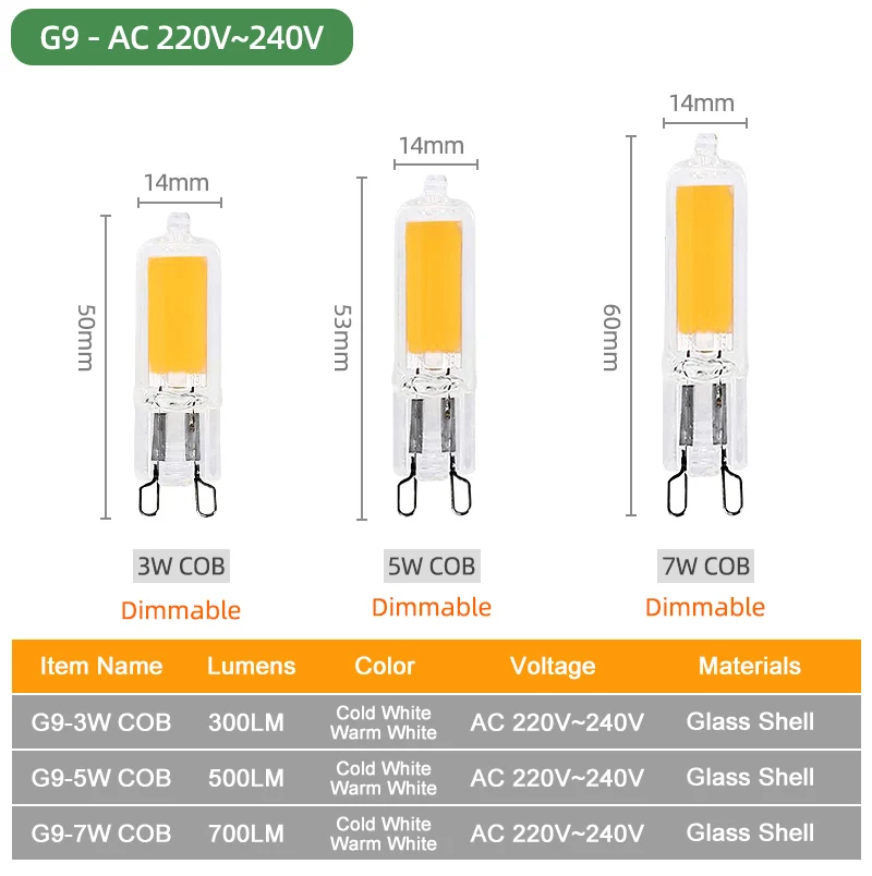 G9 мощность и Световой поток:3W 300LM / 5W 500LM / 7W 700LM / 9W 900LM