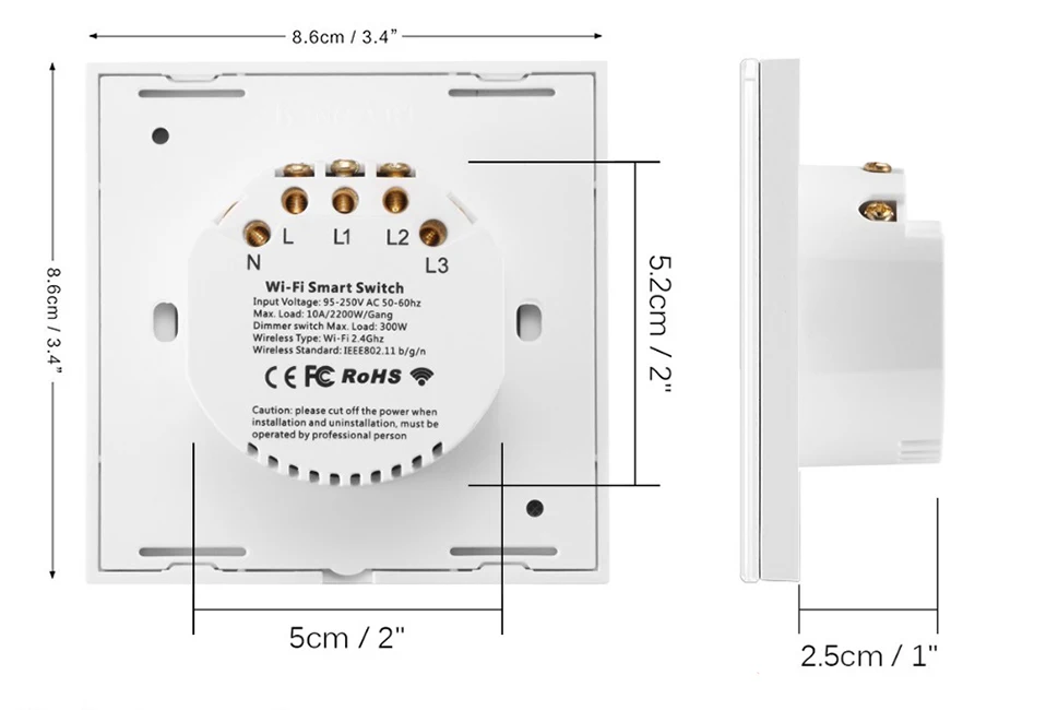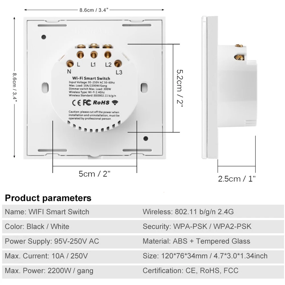 Источник питания: 95-250 В переменного тока, ГцМаксимальный ток: 10 а/250 В/группаМаксимальная мощность: 2000 Вт/группаРабочая температура: -10 ℃-45 ℃ (14 ℉- 113 ℉)Влажность при эксплуатации: ≤ 80%Приложение: Smart Life и Tuya SmartРазмер ЕС/Великобритании: 86*86*35 мм (3,4*3,4*1,4 дюйма)Тип Wi-Fi: 2,4 ГГц 802.11b/G/N