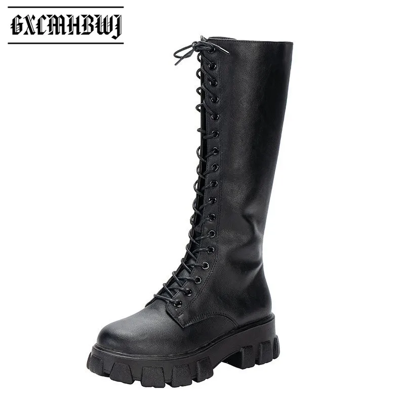 GXCMHBWJ под платье, на весну и осень, из PU искусственной кожи, кожаные сапоги выше колена с закругленным носком; Женские повседневные все-матч круглый носок на шнуровке с перекрестными ремешками на высоких каблуках; Женские ботинки на высоком каблуке;
