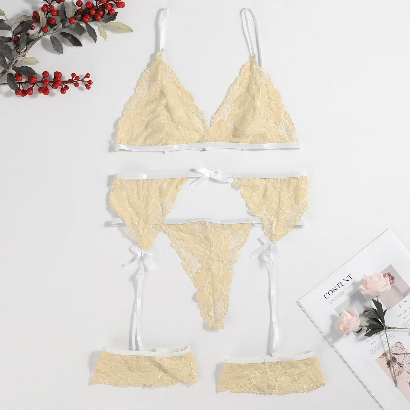 Вы получите:1 комплект сексуальной пижамы (1 бюстгальтер, 1 подвязка, 1 стринги)