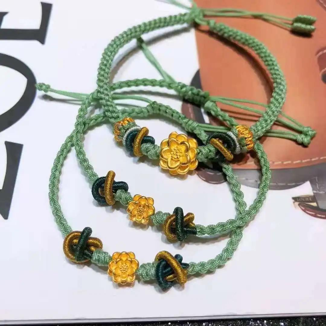 Чистый 999 настоящий золотой браслет для женщин Женский DIY толстовки для влюбленных пар маленький Лотос для женщин зеленый строка веревочный браслет 16cmL ювелирные изделия