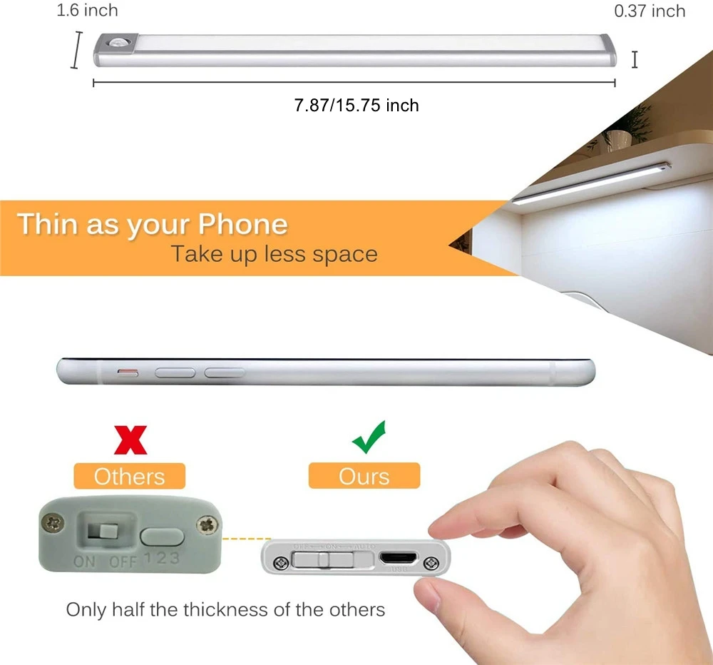 Особенность:1. Ультратонкий корпус, всего 0,8 см,2. Встроенная литиевая батарея с длительным сроком службы.3. Зарядка через USB устраняет проблемы с использованием сухих батарей, более экологически чистая4. Управление датчиком движения, более удобное в использовании5. Магнит для установки, более удобный в установке6. Три режима работы:A) выключитьБ) всегда включенС) АвтоОписание:Тип товара: светильник портативная, с датчиком движения барМатериал: алюминийДлина: 20 см/40 смПитание: перезаряжаемый через USB (встроенный аккумулятор)Цвет светильник: белый/теплый белый/натуральный белыйЦвет: серебристый