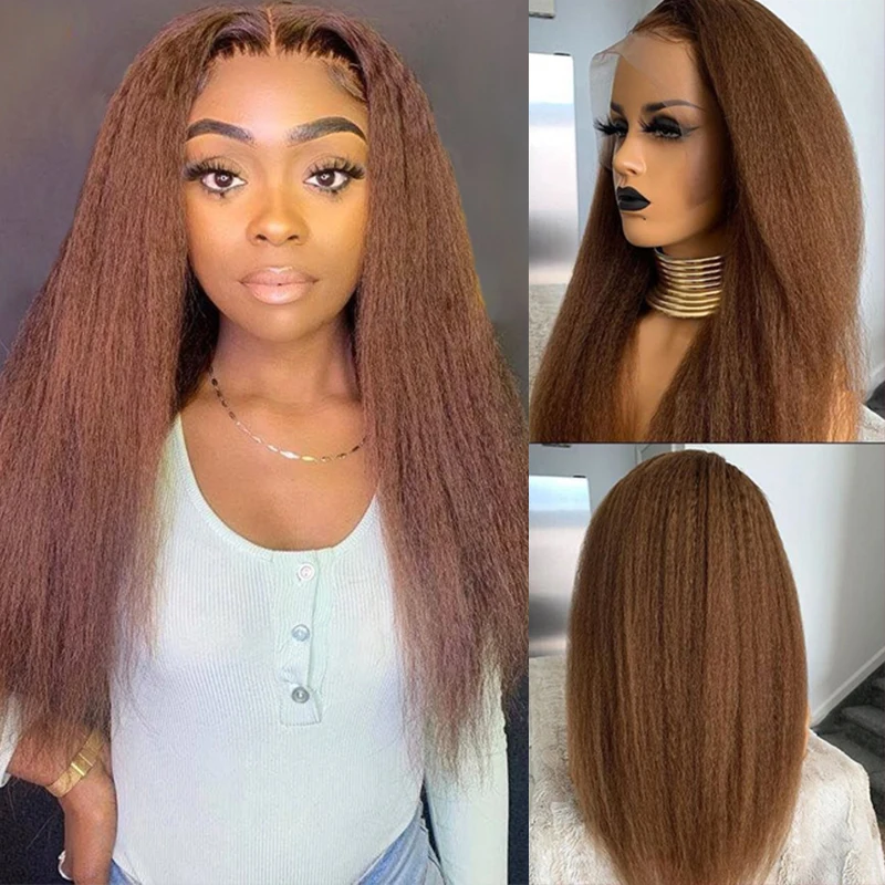 Парики из натуральных волос коричневого цвета, кудрявые прямые бразильские волосы без Реми 4x4, парик с сеткой, Т-образный парик с предварительно выщипанными вставками