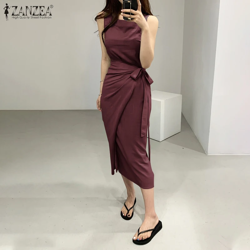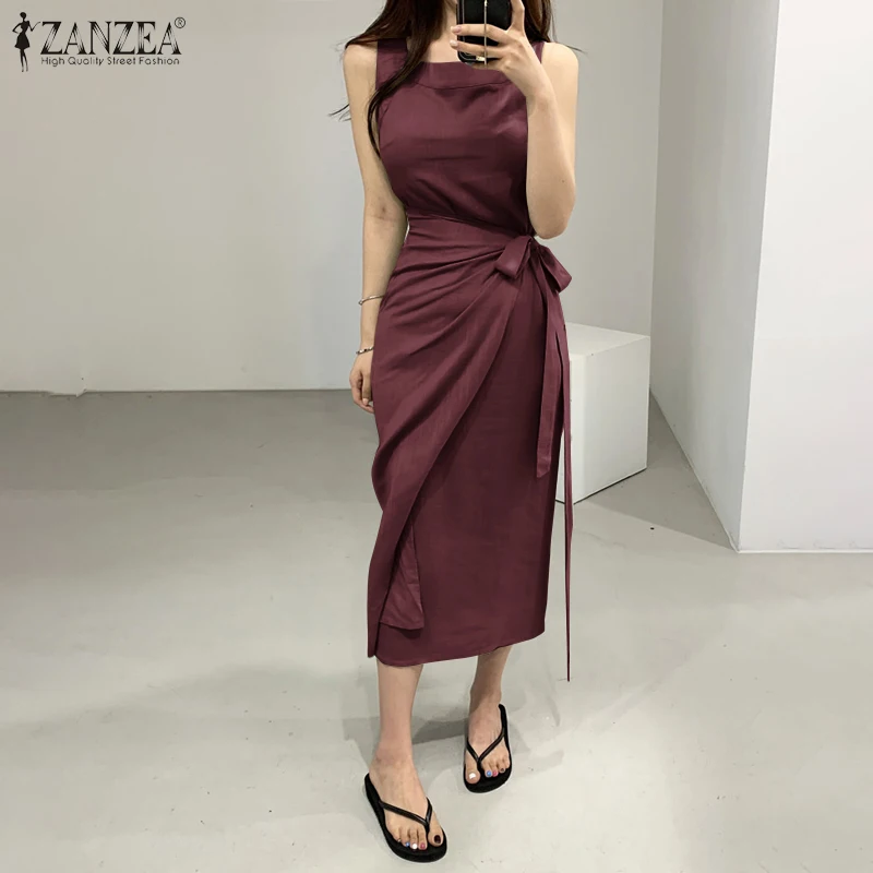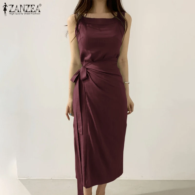 Лето 2021, элегантный рабочий сарафан ZANZEA, повседневное приталенное платье на шнуровке, Сарафаны без рукавов, платье до середины икры с квадратным вырезом