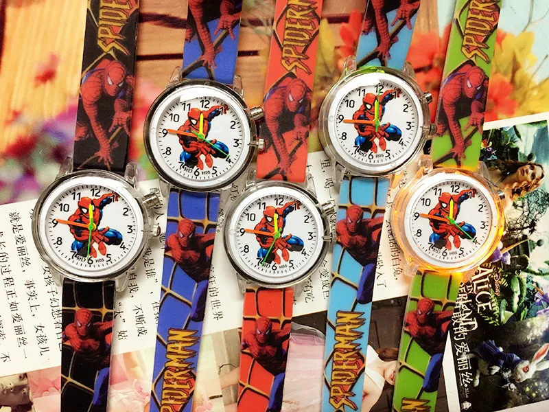 Детские часы Холодное сердце Disney, цветные светящиеся кварцевые часы с изображением Человека-паука для мальчиков и девочек, студенческие часы, подарок, наручные часы с ремешком