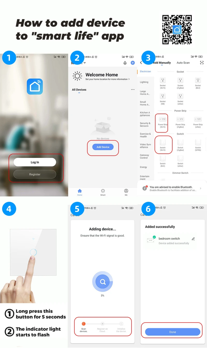 【Простая Настройка 】 отсканируйте Руководство пользователя по QR-коду, загрузите приложение Smart life/TUYA, или загрузите из App Store или Google Play Store и подключите ваше мобильное устройство к вашей Wi-Fi сети 2,4 ГГц, чтобы найти выключатель света, тогда вы можете легко включать свет или управлять другими электрическими устройствами.