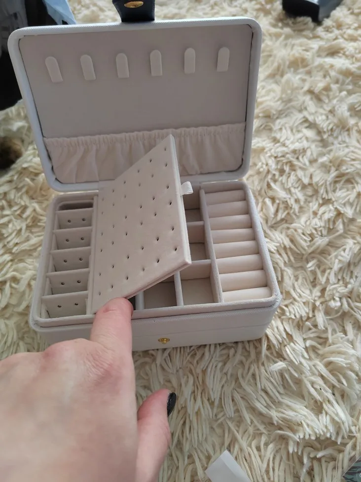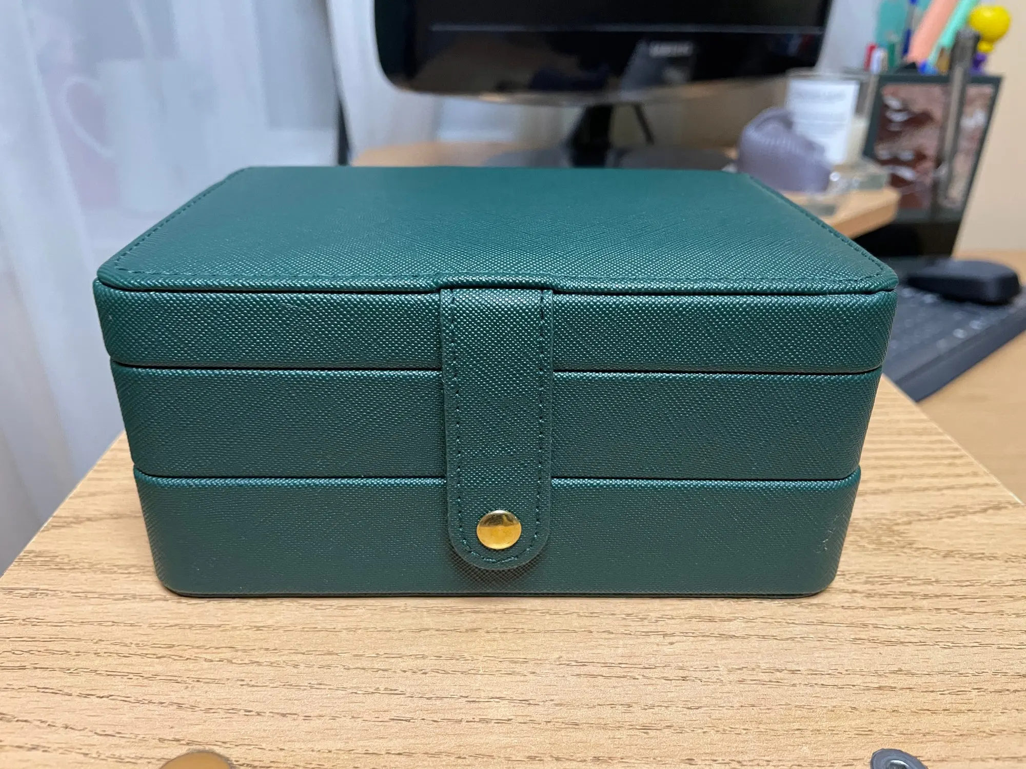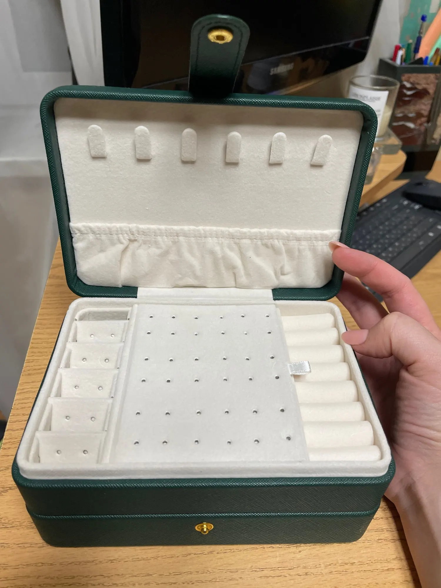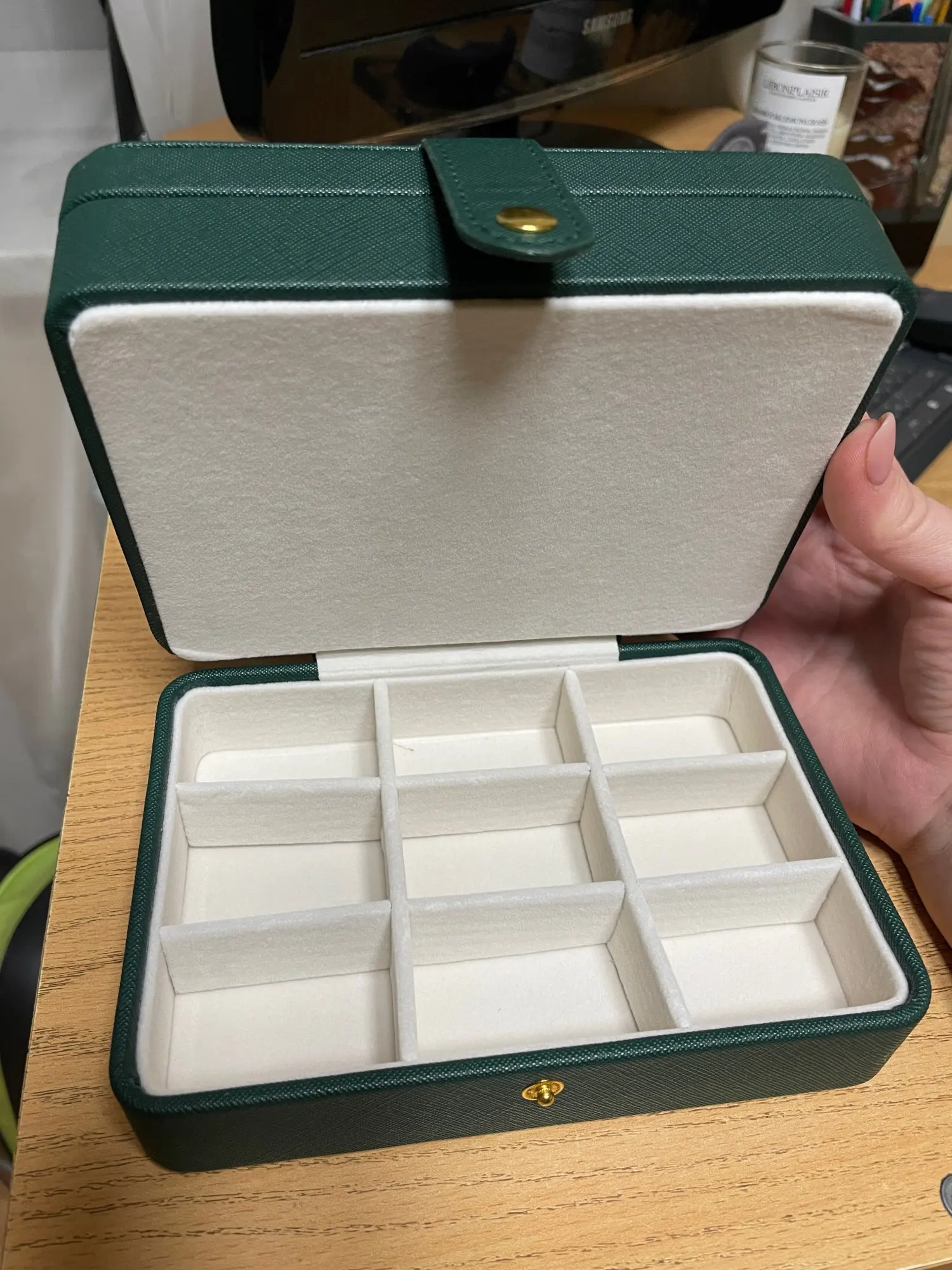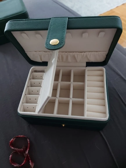 Классная шкатулка, стоит своих денег. Я заказала насыщенного зелёного цвета - в принципе такой и есть. Один минус, и то для любителей серёжек с английской застежкой, - их здесь зацепить не за что, только если класть в отдельное углубление :)