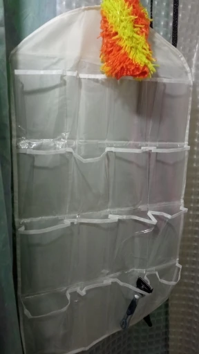 Этот органайзер поверх двери изготовлен из полиэфирной ткани и прозрачного полиэтиленового пакета, поэтому его жесткость и хорошо удерживает форму при подвешивании на стене.