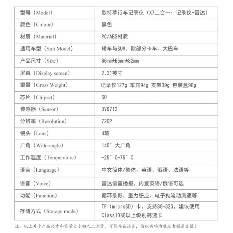 Стеклянные линзы, устойчивость к высоким и низким температурам, высокий коэффициент пропускания светильник, более четкое изображение вождения., чувствительный g-сенсор автоматически обнаруживает внезапное столкновение и немедленно сохраняет соответствующий отснятый материал и восстанавливает место аварии., широкий угол в 140 °, более широкое поле обзора, изображение не будет искажено, Может восстановить ситуацию вождения., можно переключать несколько языковых режимов, включая Упрощенный китайский, традиционный китайский, английский, русский, французский и другие языки. Благодаря функции детектора радаров 2 в 1 и автомобильного видеорегистратора он может записывать состояние вождения и эффективно уменьшать поведение при нарушении дорожного движения.