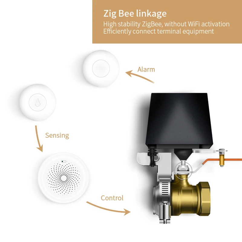 【Умная связь】Связывайтесь с другими смарт-устройствами ZigBee для создания умных сцен. Например, он может быть соединен с детектором утечки воды и манипулятором для автоматического закрытия водяного клапана при обнаружении утечки воды.