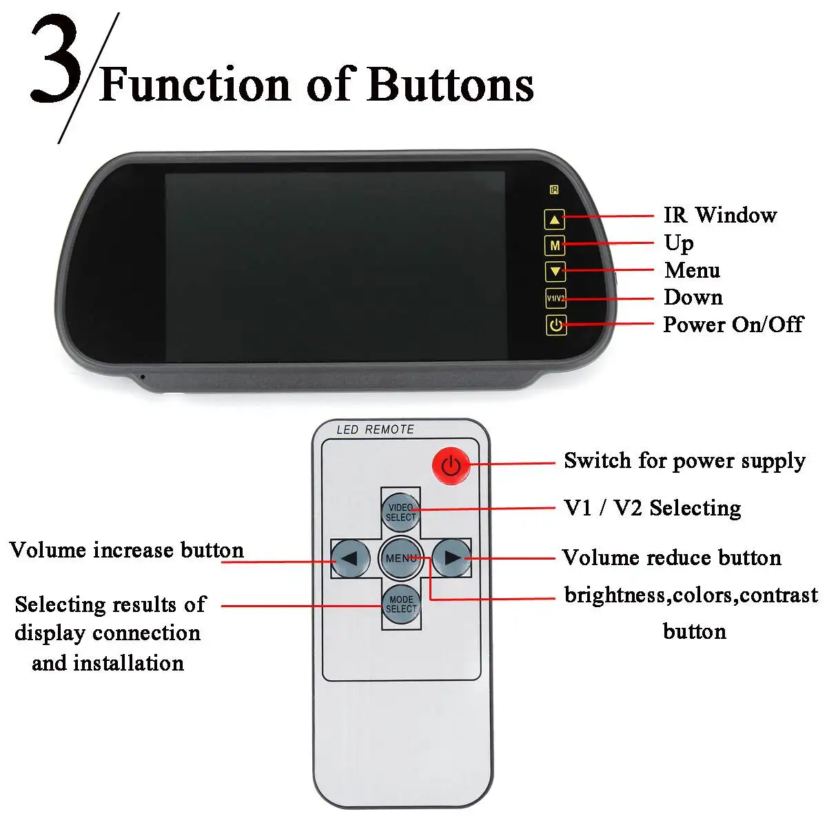 Описание:4 контактный разъем10 м подключение видео RCAМониторМонитор поставляется с двойным видео входом (i.e. V1 и V2), с видео V1 по умолчанию, когда обратная передача не включена, как только обратная передача включена, монитор автоматически переключается на видеовход V2.Переключение между входами V1 и V2 (если нет заднего хода) может быть выполнено нажатием кнопки V1/V2 на правой стороне дисплея или с помощью кнопки дистанционного управления: «Выбор видео».Дисплей автоматически включается при включении обратной передачи, и если нетВидеосигнал, монитор может быть включен/выключен нажатием кнопки питания.