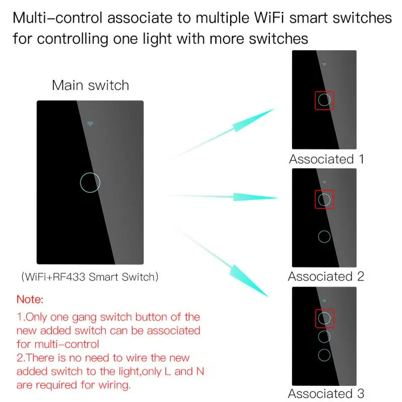 1. Новая идея для цепи 2/3 (два переключателя управляют один светильник), которая объяснена как мультиуправляемая связь этого переключателя с другими смарт-переключателями WiFi в приложении; Емкостное сенсорное управление, Включите/выключите светильник одним касанием и устойчивостью к царапинам стеклянная панель дает лучший вид, чтобы сочетаться с любым дизайном стены. (Примечание: Вы можете управлять несколькими связями этого переключателя с несколькими различными переключателями, но несколько банд на одном коммутаторе недоступны, для мульти-контроля можно использовать только один переключатель.)