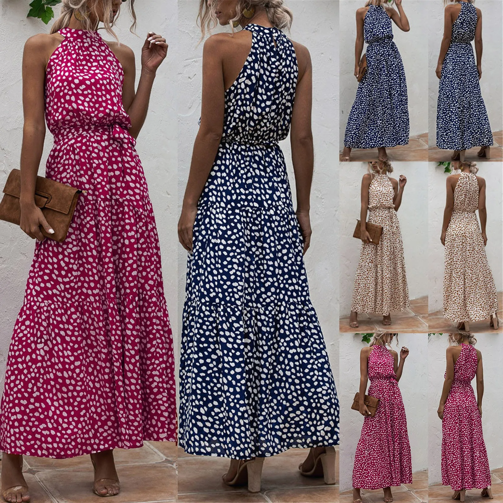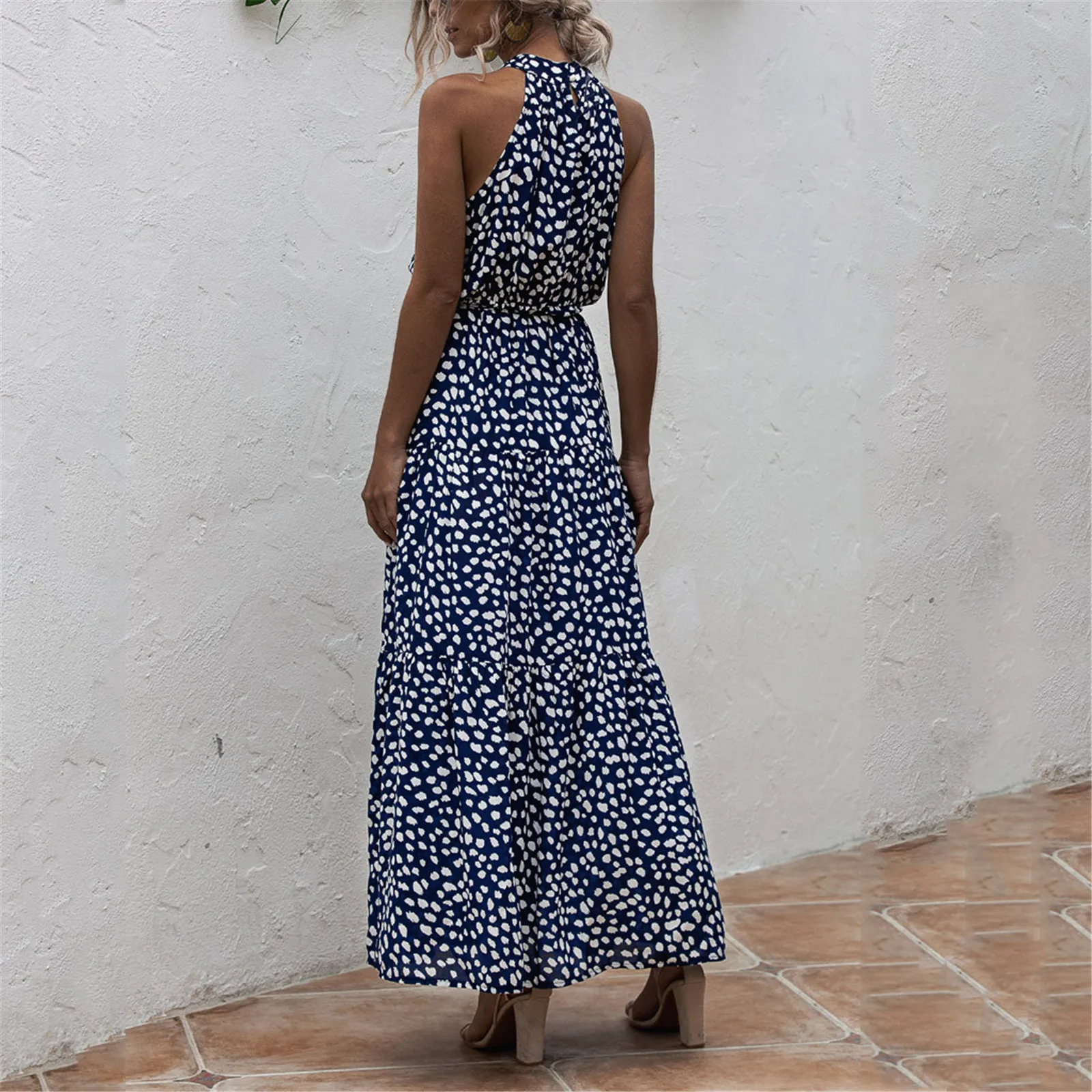 Женская летняя обувь модные резиновые сапоги с рисунком в горошек и Цветочный принт в стиле Бохо длинное вечернее платье вечерние Пляжное платье с лямкой на шее без рукавов с открытыми плечами, без рукавов, длинное платье в пол