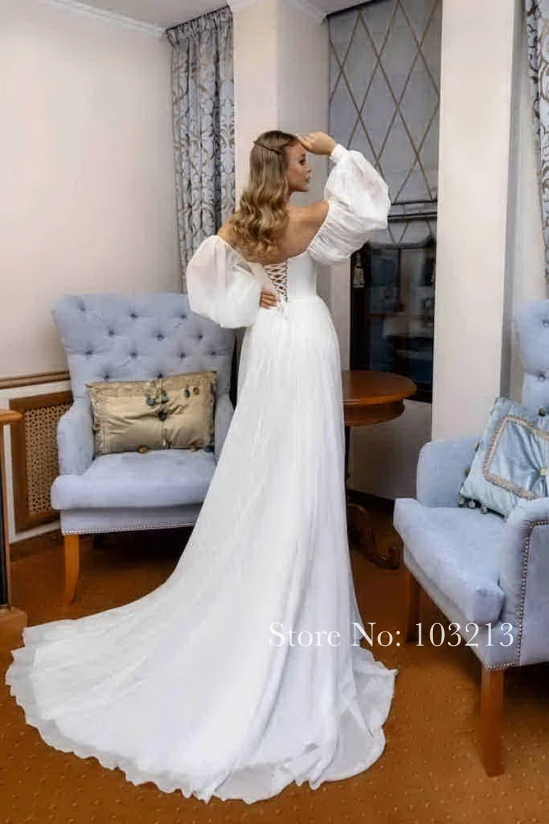 Шифоновое свадебное платье со шлейфом Glam, ТРАПЕЦИЕВИДНОЕ ПЛАТЬЕ с длинными рукавами и открытыми плечами, 2021