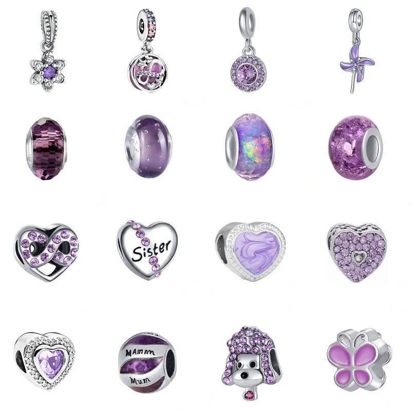 Новинка, фиолетовая серия, очаровательные сердца, бабочки, звезды, сверкающие стеклянные бусины из циркония, подходят для оригинальных браслетов Pandora, женские Украшения сделай сам для девочек