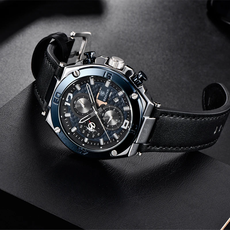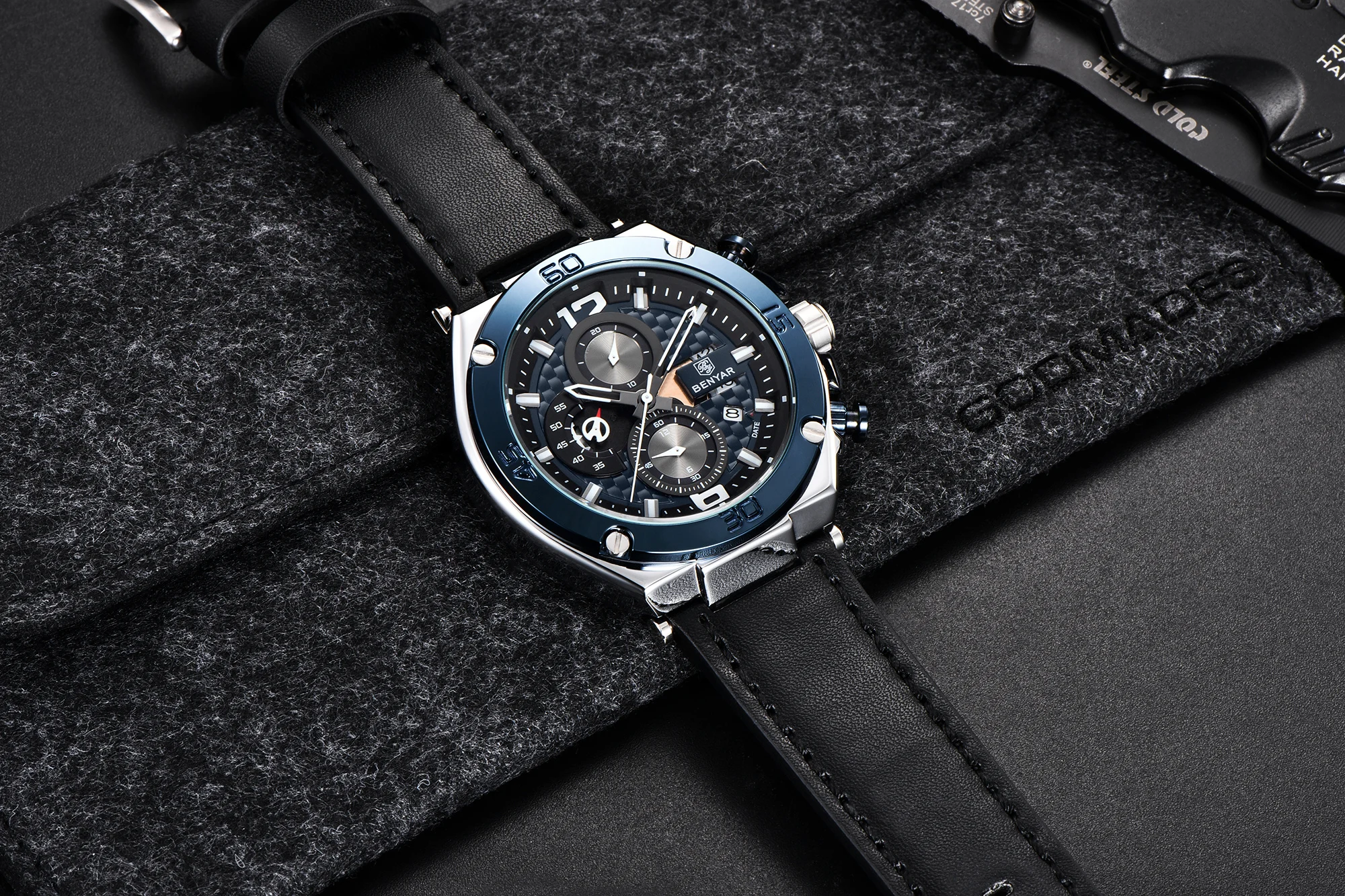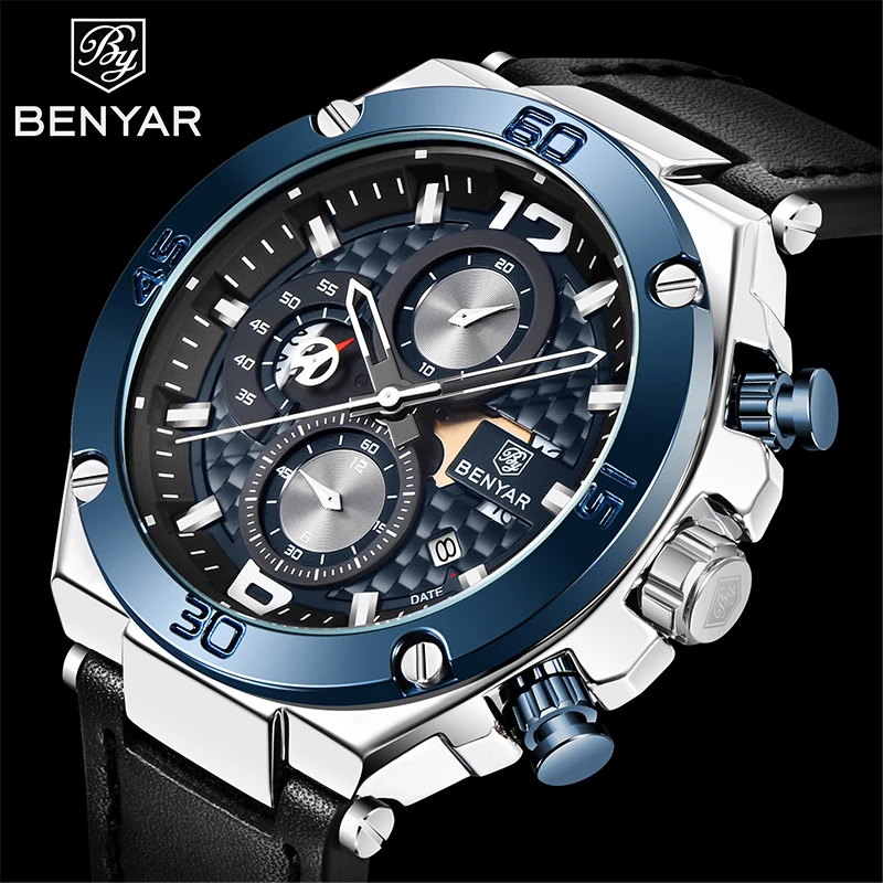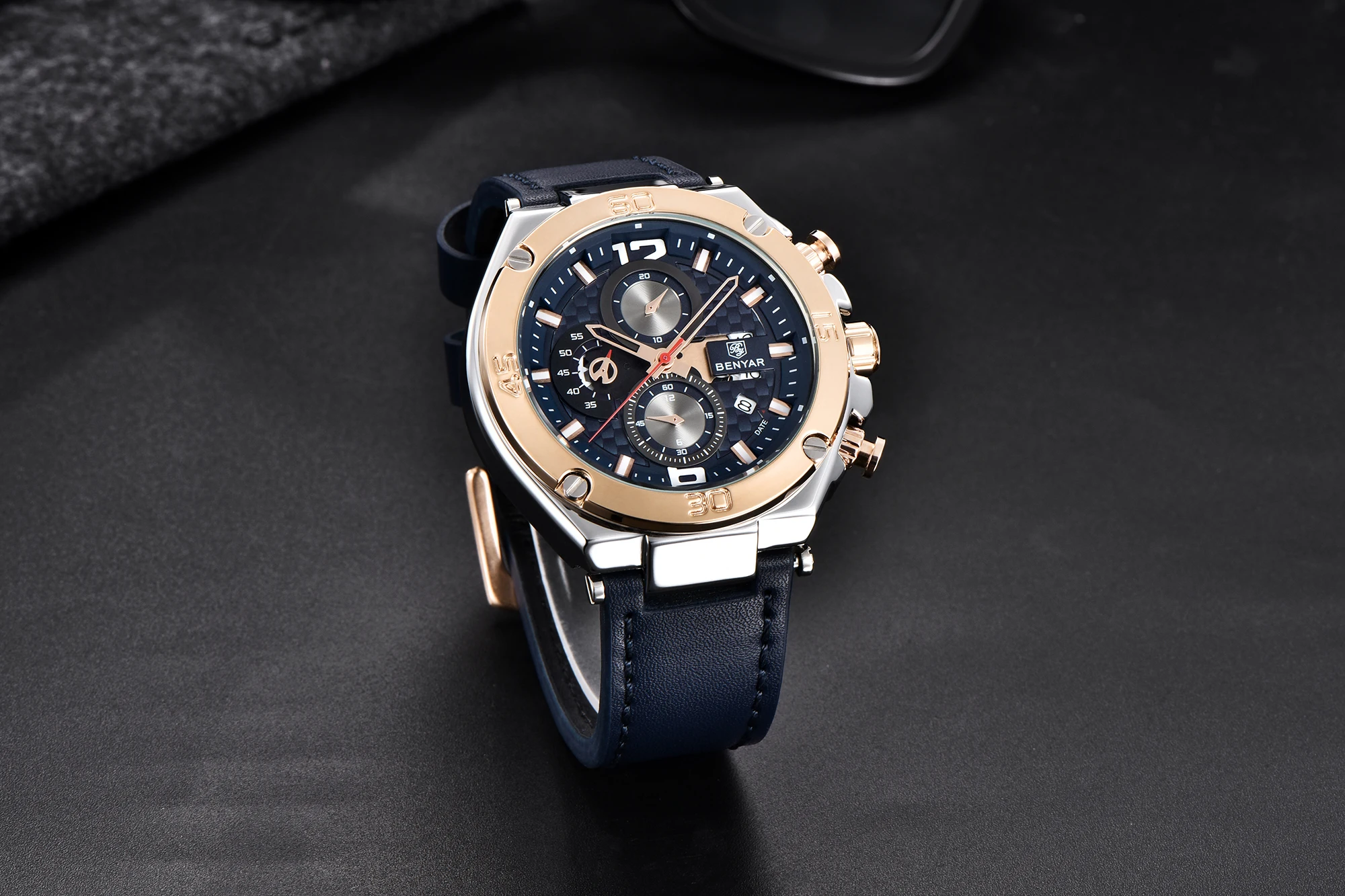 BENYAR Роскошные Брендовые спортивные мужские часы с кожаным ремешком, мужские Модные наручные часы с хронографом, мужские часы в стиле милитари