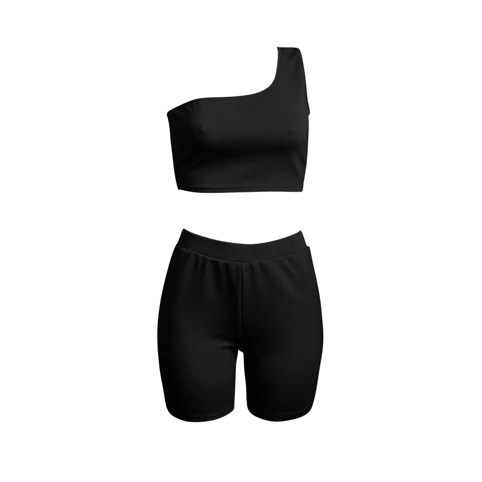 Летний женский короткий комплект 2021, однотонный дышащий облегающий модный жилет с коротким рукавом на одно плечо, Женский комплект из двух предметов