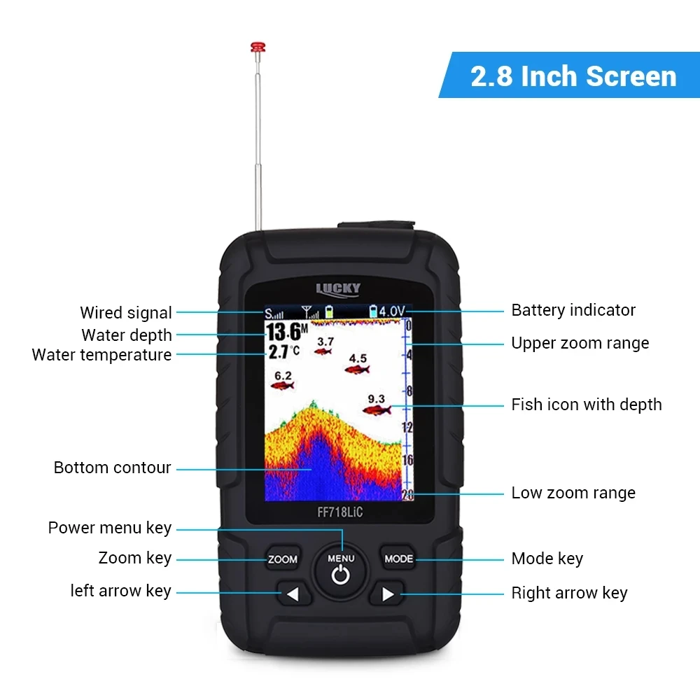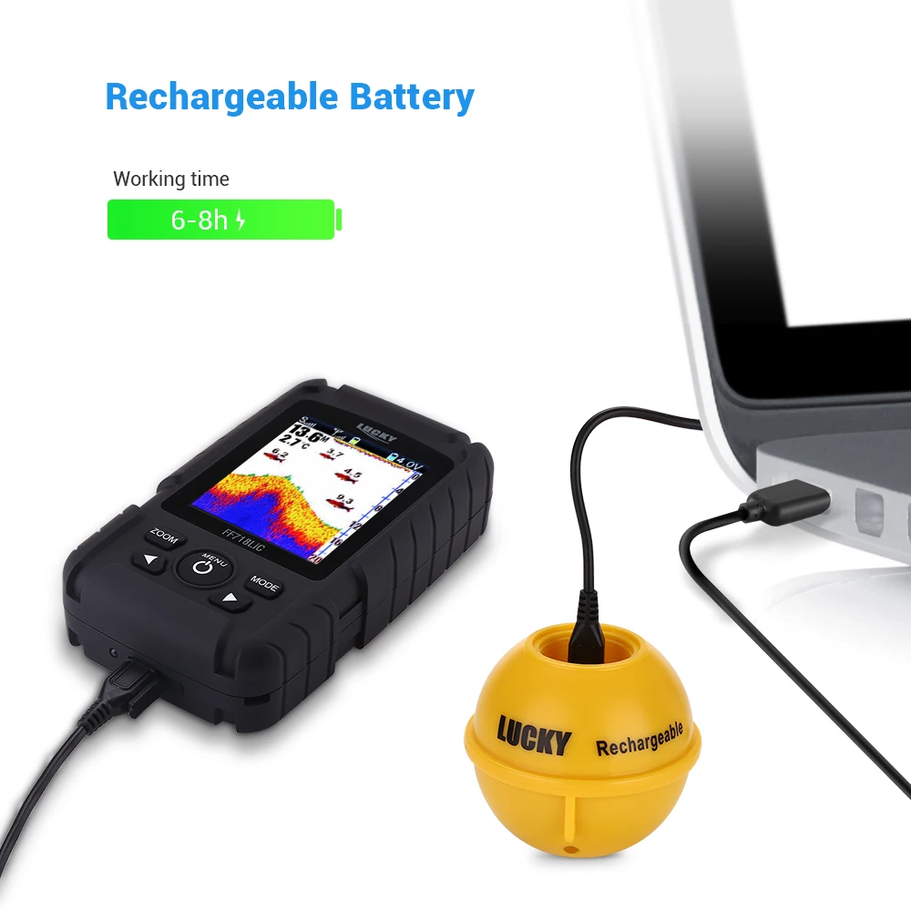 Особенности:С цветным дисплеемЭтот рыболокатор предназначен для ловли рыбы. Он может обнаруживать местоположение рыбы и размер рыбы как в пресной, так и в соленой воде и может использоваться в качестве зонда глубины.Глубина воды, температура воды, расположение рыбы, нижний контур может быть постоянно получен из водыВстроенный в память хранит гидролокатор, когда рыболокатор выключенБеспроводной датчик может выключиться, когда он выходит из водыПлавучий и водонепроницаемый гидролокатор.Описание:Портативный рыболокатор глубина водонепроницаемый рыболокаторГлубина воды, температура воды, расположение рыбы, нижний контур может быть постоянно получен из водыПользовательский выбор чувствительности, Зума, единиц измерения, дальность глубины, неглубокая сигнализация, значок рыбы, сигнализация рыбы и настройка скорости диаграммыСпецификация:Модель: FF718LiC-WМатериал: АБС-пластикЦвет: желтый и черныйТип: ЕС, Великобритания, СШАРазмер основного продукта: 125*70 ммРазмер датчика гидролокатора: 70*70 ммРазмер посылка: 14,7*8*9,5 смРыболокатор:Дисплей: 2,8 дюймовый цветной TFT ЖК-дисплей 240 × 320 (RGB)Подсветка: Вкл/Выкл Белый светодиодныйВарианты языка: английский/русскийРабочая температура: -14-122 °F (-10-50 °C)Мощность: 1*3,7 V перезаряжаемая литиевая батарея (все указанные аккумуляторы входят в комплект поставки)Напряжение зарядного устройства: 5 В 500 мАВремя работы: 10 часовДатчик гидролокатораУгол луча: 90 °Глубина Диапазон: 0,7-для использования на глубине до 45 м/2-145ftРабочая частота: 125 кГцРабочий диапазон: 200 мБеспроводная Частота: 433,92 МГцТребования к питанию: 1 * CR2032 (в комплекте)Время работы: 40 часовПосылка включает в себя:1 * рыболокатор1 * Беспроводной датчик гидролокатора1 * зарядное устройство1 * Автомобильное зарядное устройство1 * зарядный кабель1 * шейный ремешок1 * Руководство пользователя