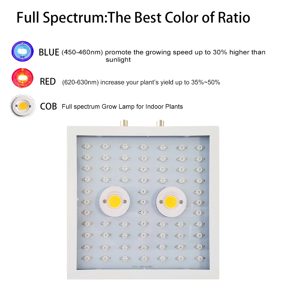 1. Используйте высококачественный светодиодный источник освещения, срок службы до 50000 часов. 2. Входная система охлаждения, хорошо решить проблему теплоотвода. 3. Экологически чистый, без ртути и других вредных тяжелых металлов. 4. Фактическое потребление энергии: энергосбережение, просто потребляет около 0 Вт-114 Вт Мощность (может затемняться), гораздо лучше, чем тот же продукт на рынке 5. Полный спектр для вегетативной и цветущей стадии: 430 ~ 440nm, 450 ~ 475nm, 620 ~ 630nm, 650 ~ 670nm, белый, IR(730nm) 6. Подходящее место: садоводческий саженец/парниковый растительный/комнатный растительный светильник 7. Полный спектр: 1000 Вт двойной чип и 1 шт. COB чип, Вес: 1,5 KG, угол обзора светодиодов: 120 8. Покрытие: основная площадь покрытия 48 "* 48"(4*4 фута). Максимальная площадь покрытия на 86 "* 76" (7,2 * 7.2ft). Самые полезные покрытие: 24 "высота Советы по использованию:-Рекомендуемое Непрерывное время работы: 10-16 часов в день-только для использования в помещении, не является водонепроницаемым. 9. Люмены: 4038лм, размер изделия: 290x70x250 мм; Синие Бусины: 450-460нм 8; Красные бусины: 620-630нм 34;COB: 380 ~ 800нм, весь спектр содержит 100 бусин (красный, синий, белый, инфракрасный, ультрафиолетовый) Количество светодиодов: 42 + 1 COB Как использовать: Светильник с интенсивностью: 250PAR-seed период, ручка синий + COB =(60-80) ручка красный = 0 450-600PAR -- период роста, синяя ручка + COB =(50-80) Красная ручка = 60-80 700-800PAR-период цветения, ручка синий + COB =(80-100) ручка красный = 80-100 400PAR-за последние 3 недели, ручка синяя + COB =(40-60) ручка красная = 60-80