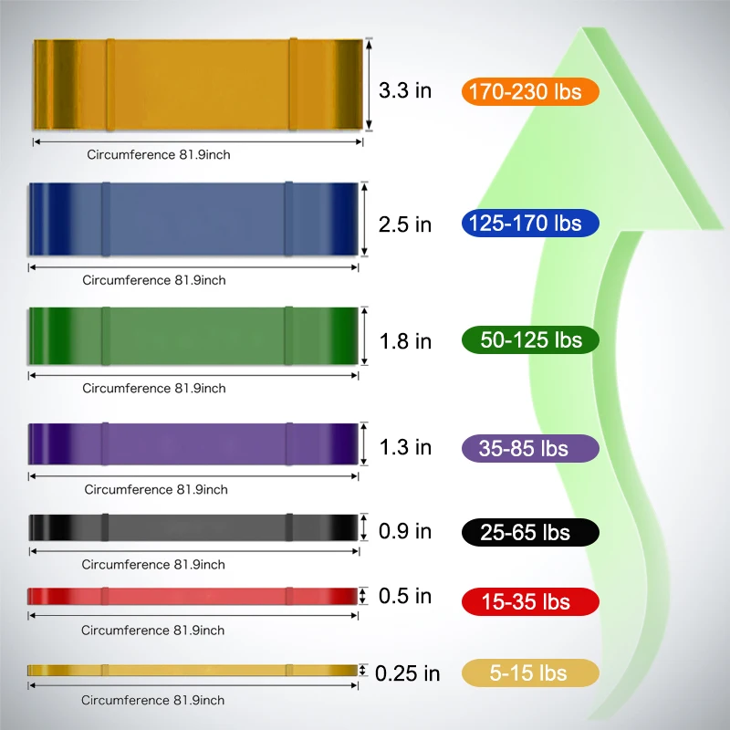 Диапазон сопротивления: желтый 5-15 фунтов, красный 15-35 фунтов, черный 25-65 фунтов, фиолетовый 35-85 фунтов, Зеленый 50-125 фунтов, синий 125-170 фунтов, оранжевый 170-230 фунтов