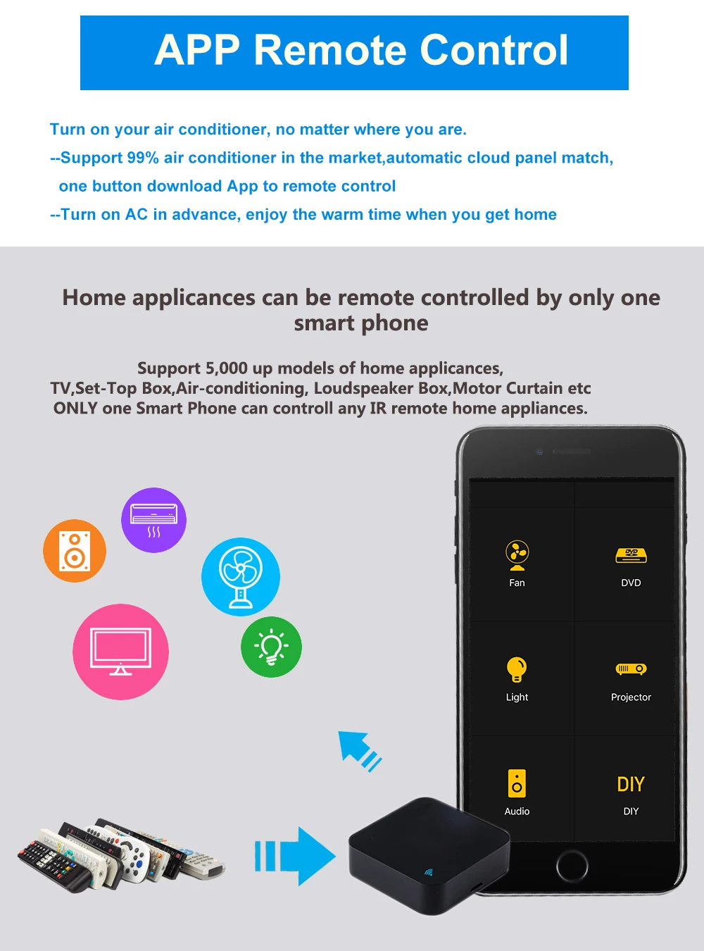 1. Какие устройства могут управлять с помощью пульта дистанционного управления WiFi? Вы можете управлять телевизором, вентилятором, кондиционером и другими ИК-устройствами. 2. Что делать, когда я не могу управлять устройствами с помощью этого пульта дистанционного управления? Во-первых, убедитесь, что ваше мобильное устройство и пульт дистанционного управления Wi-Fi находятся рядом и подключены к той же сети, гарантируя, что инфракрасный пульт дистанционного управления Wi-Fi всегда включен. 3. Могу ли я управлять устройствами через сеть 2G/3G/4G? Пульт дистанционного управления Wi-Fi и мобильное устройство должны совместно использовать ту же сеть Wi-Fi при первом добавлении пульта дистанционного управления WiFi. После завершения конфигурации устройства вы можете удаленно управлять устройствами через сотовую сеть 2G/3G/4G/5G. 4. Что делать, когда процесс конфигурации устройства сбой?Вы можете:Проверьте, включен ли пульт дистанционного управления или нет. 1) Проверьте, подключено ли ваше мобильное устройство к сети WiFi to2.4GHz. 2) проверьте подключение к сети, убедитесь, что маршрутизатор работает должным образом. 3) Убедитесь, что введенный пароль WiFi верен при добавлении пульта дистанционного управления. 5. Может ли он проходить через стены или использоваться для управления ИК-устройствами в комнатах наверху/внизу? ИК не может проходить через стены, поэтому убедитесь, что между ИК-пультом и ИК-устройствами Нет препятствий. 6. У нас есть телеприставка Huawei/Xiaomi, почему он не подключается? Существует два типа телеприставок: OTT и IPTV, наиболее очевидная разница в том, что IPTV поддерживает Потоковую передачу, в то время как OTT не поддерживает. Перед установкой убедитесь, что у вас есть подходящая ТВ-коробка. 7. Что мы должны делать, когда мы не можем использовать ИК-пульт для управления электрическим устройством?Пожалуйста, проверьте следующее: 1). ИК-удаленная сеть в хорошем состоянии (нажмите любую клавишу на пульте дистанционного управления в приложении и посмотрите, начинает ли светодиодный светильник мигать. Если он мигает, это означает, что он работает должным образом. 2). Нет блокирования объекта между ИК-пультом и электрическим устройством 3). Заводское дистанционное управление электрическим устройством включено ИК. (закройте верхнюю часть пульта дистанционного управления рукой или любым предметом, затем нажмите любые кнопки. Если устройство не отвечает, оно основано на ИК, в противном случае это Дистанционное управление на основе Bluetooth или RF.)