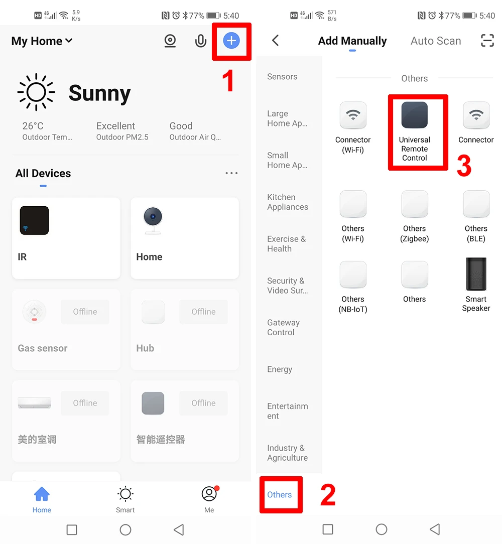 После установки приложения и регистрации вашей учетной записи. Для подключения к системе требуется всего шесть простых шагов.1. Нажмите «Другие» в главном интерфейсе.2. Выберите «универсальный пульт дистанционного управления»3. Выберите Wi-Fi, к которому вы хотите подключить ваше устройство (и ваш смартфон также должен подключиться к этому WiFi), и введите пароль WiFi.4. Когда приложение обнаруживает устройство, устройство будет отображаться на странице обнаружения.5. Пожалуйста, укажите правильное имя устройства, которое очень легко управлять.