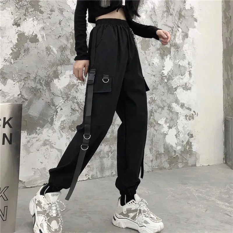 Брюки-карго женские в стиле панк, джоггеры с карманами на цепочке, свободные черные мешковатые брюки в стиле Харадзюку, большие размеры, хип-хоп