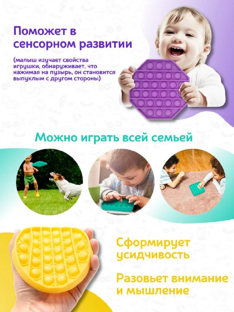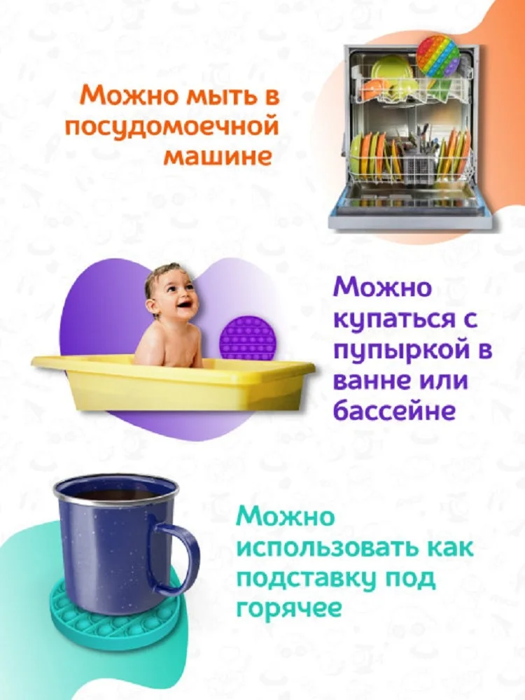 Вечная пупырка POP IT - это тренд 2021 года, который моментально увлекает детей и взрослых. Это отличный способ занять время и поднять настроение, её просто не хочется выпускать из рук! Яркая сенсорная игрушка с долговечными лопающимися пузырьками - лучший антистресс. По тактильным ощущениям она напоминает всеми обожаемую пупырчатую плёнку, но при этом её можно хлопать без остановки. Вечная пупырка (Поп ит) при нажатии схлопывается внутрь и этот процесс может быть бесконечным. Благодаря такой механике - игрушка очень успокаивает и вовлекает. Кроме того она развивает мелкую моторику пальцев, поэтому её можно давать детям для стимуляции сенсорики. А пока ребёнок занят вы сможете отдохнуть или позаниматься своими делами.
