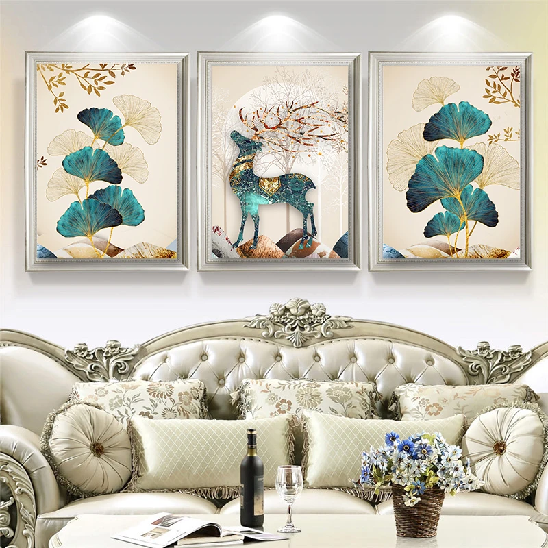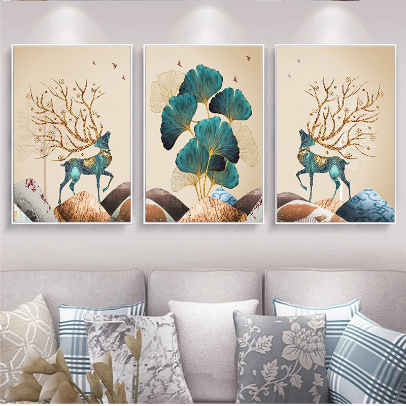 Абстрактный роскошный постер гинкго с листьями, цветами, оленями, настенная Картина на холсте с зеленым принтом, домашний декор для гостиной, дизайнерская картина